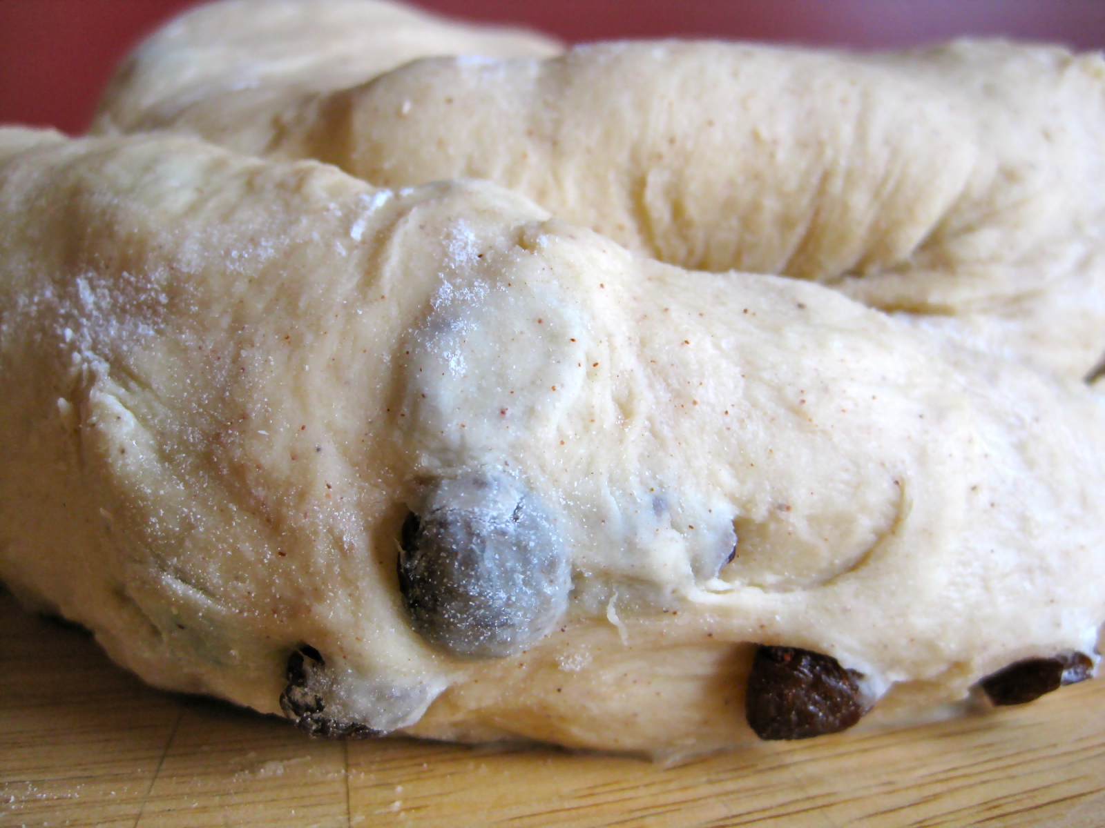 Turn the dough out onto a lightly floured counter and knead in raisins by hand until evenly distributed. Continue to knead the dough, forming it into a smooth, round ball.  Place the dough in a large, lightly oiled bowl and cover with greased plastic wrap.  Let rise in a warm place until doubled in size, 1 to 1 1/2 hours.
