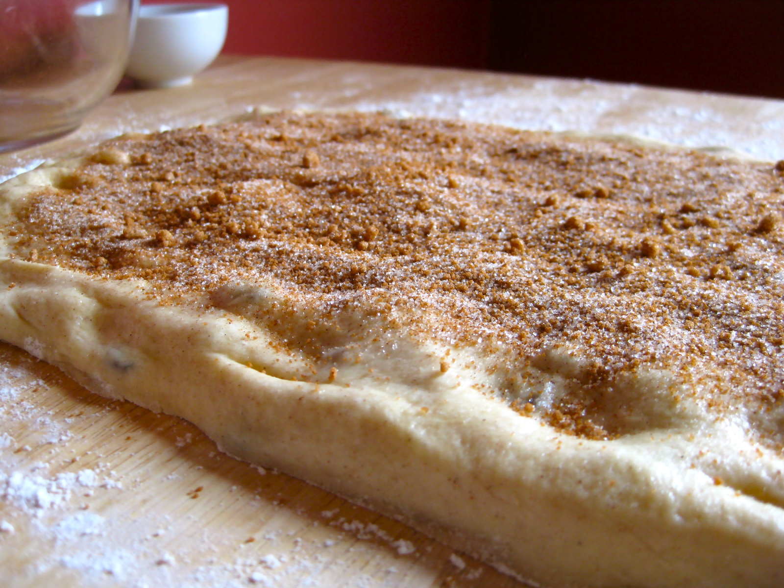 Grease a 9 x 5 inch loaf pan.  Turn the dough out onto a lightly floured counter and press into a 20 x 8 inch rectangle with the short side facing you.  Spray the dough lightly with water, then sprinkle evenly with the remaining cinnamon sugar, leaving a 1/2 inch border at the far edge.  Lightly spray the cinnamon sugar with water until it is damp but not wet.
