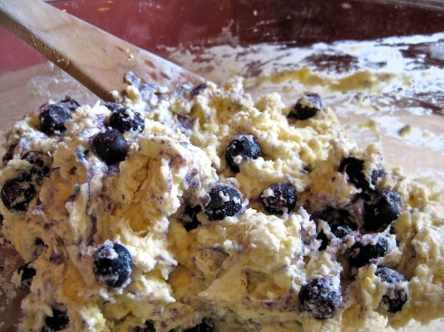 Add the buttermilk or soured milk, the egg, and the lemon zest to the flour mixture. Stir just enough to moisten everything, until the batter just begins to stiffen. Gently fold in blueberries. If using the food processor, add the milk, egg, and lemon zest through the feed tube, and pulse just until the dough comes together and it begins to form into one mass. Knead in the blueberries once the dough has been removed from the food processor. It should go without saying that you should not pulse the blueberries in the food processor.