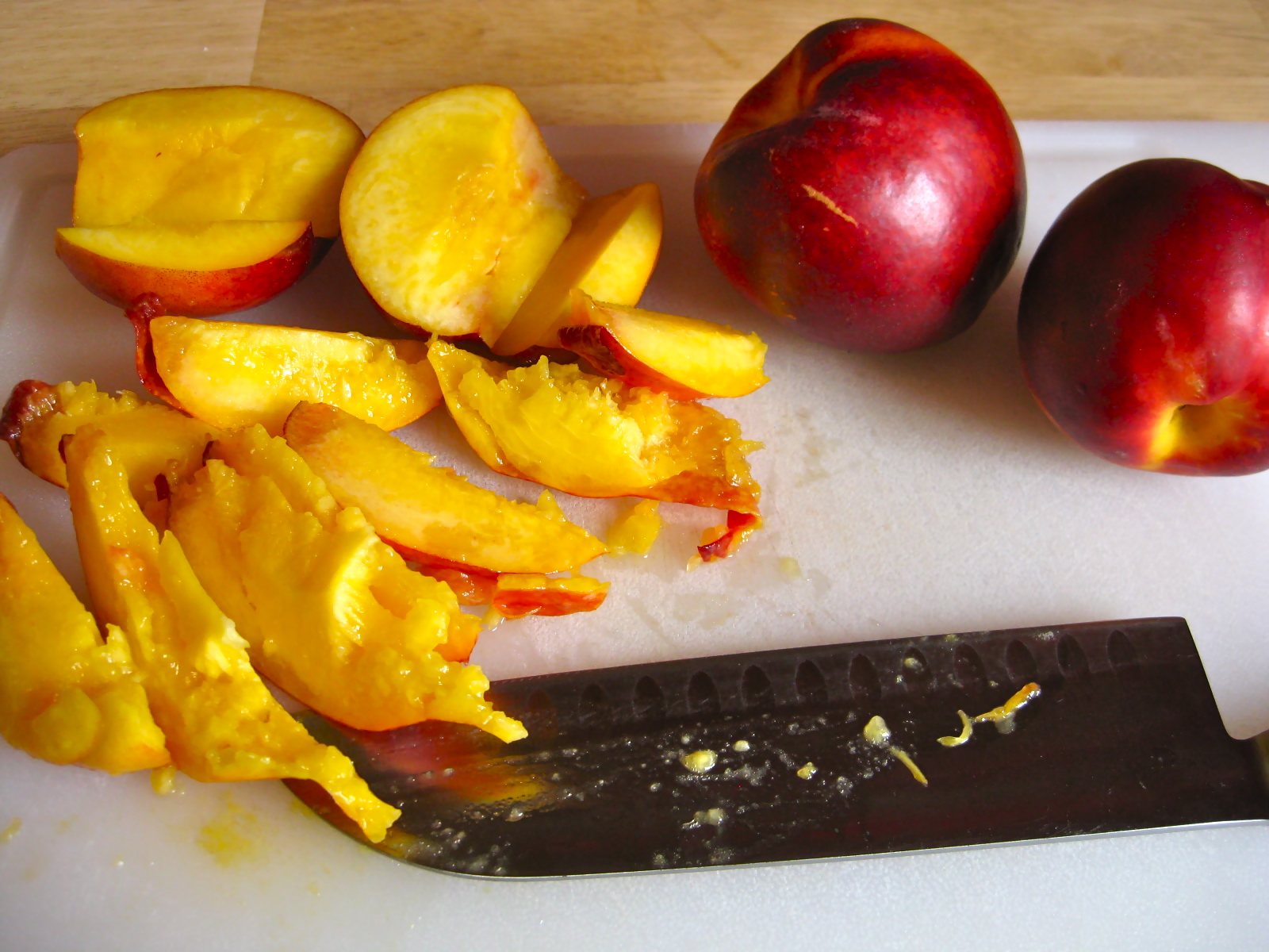 Cut each nectarine in half, remove the pit, and each half cut into 4 wedges.