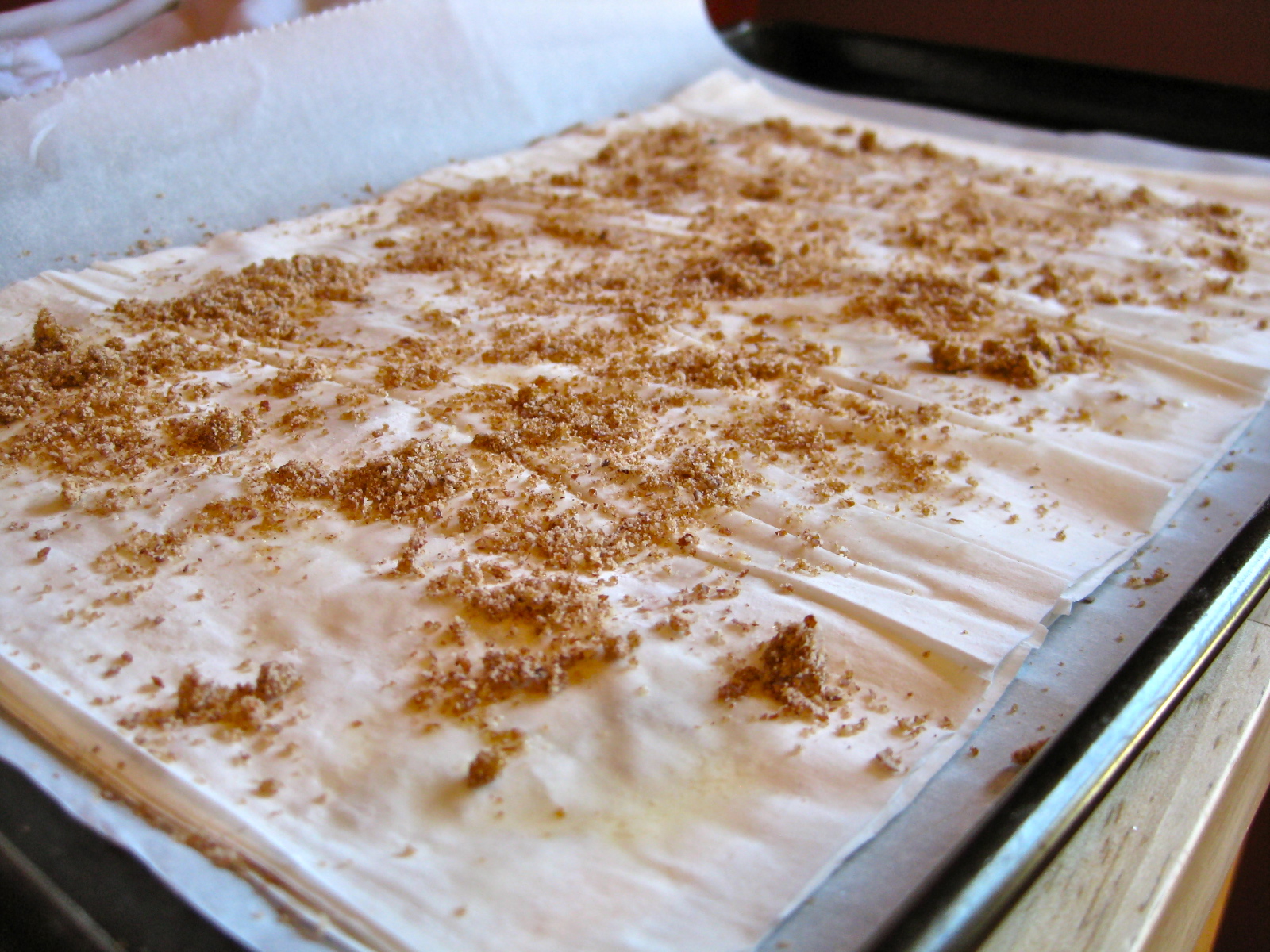 Cover unrolled phyllo stack with a lightly dampened kitchen towel (this will keep the phyllo from drying out as you work). Take two phyllo sheets from stack and lay them down on your parchment-lined baking sheet with a long side nearest you (keeping remaining sheets covered as you work) and brush lightly with butter. Evenly sprinkle surface of buttered phyllo with a heaping tablespoon of ground almond mixture. Continue layering, buttering, and sprinkling in this fashion until all of the phyllo sheets have been used. The number of layers you will have will depend largely on the size of your phyllo sheets.