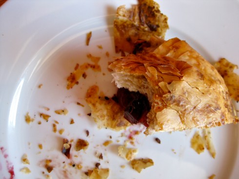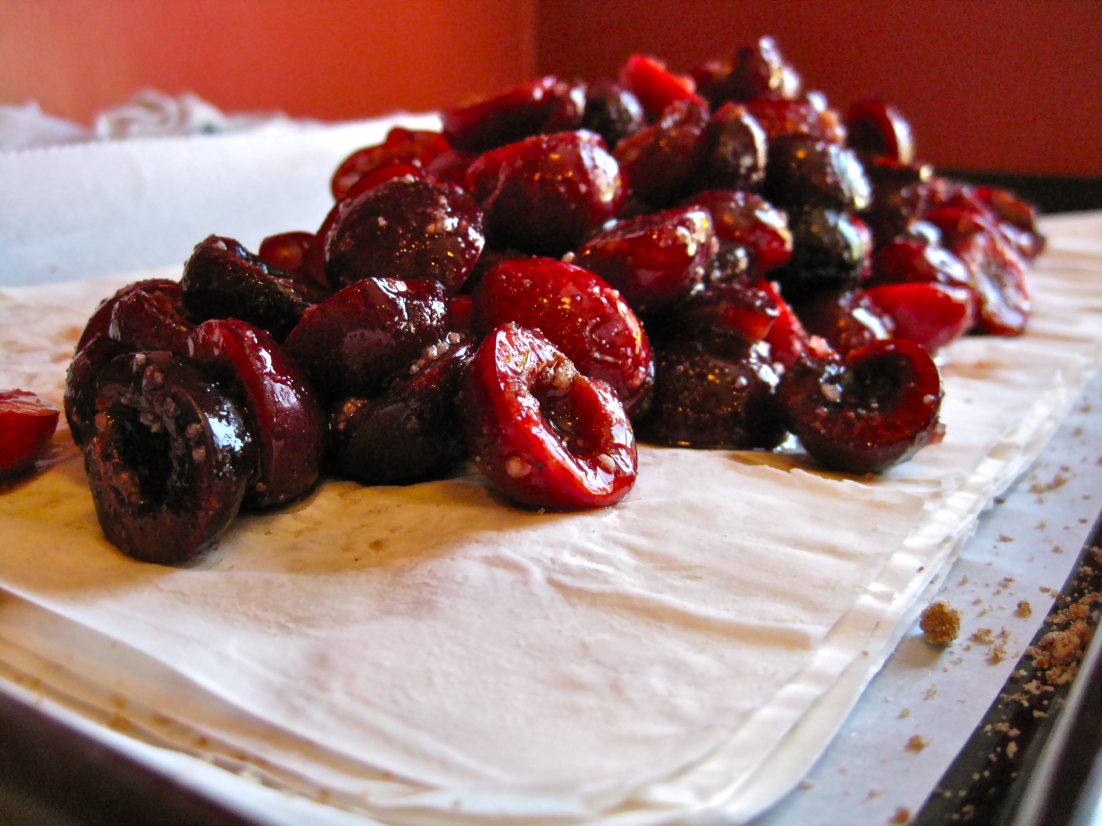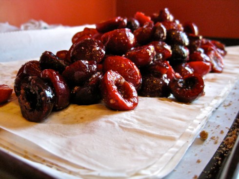 Do you enjoy seemingly infinite layers of shatteringly crisp phyllo? What are your feelings concerning rich, dark cherries? How about a dash of almond in each bite playing off of the lingering almond scent of cherry pits? You approve? Great! You want to make this.