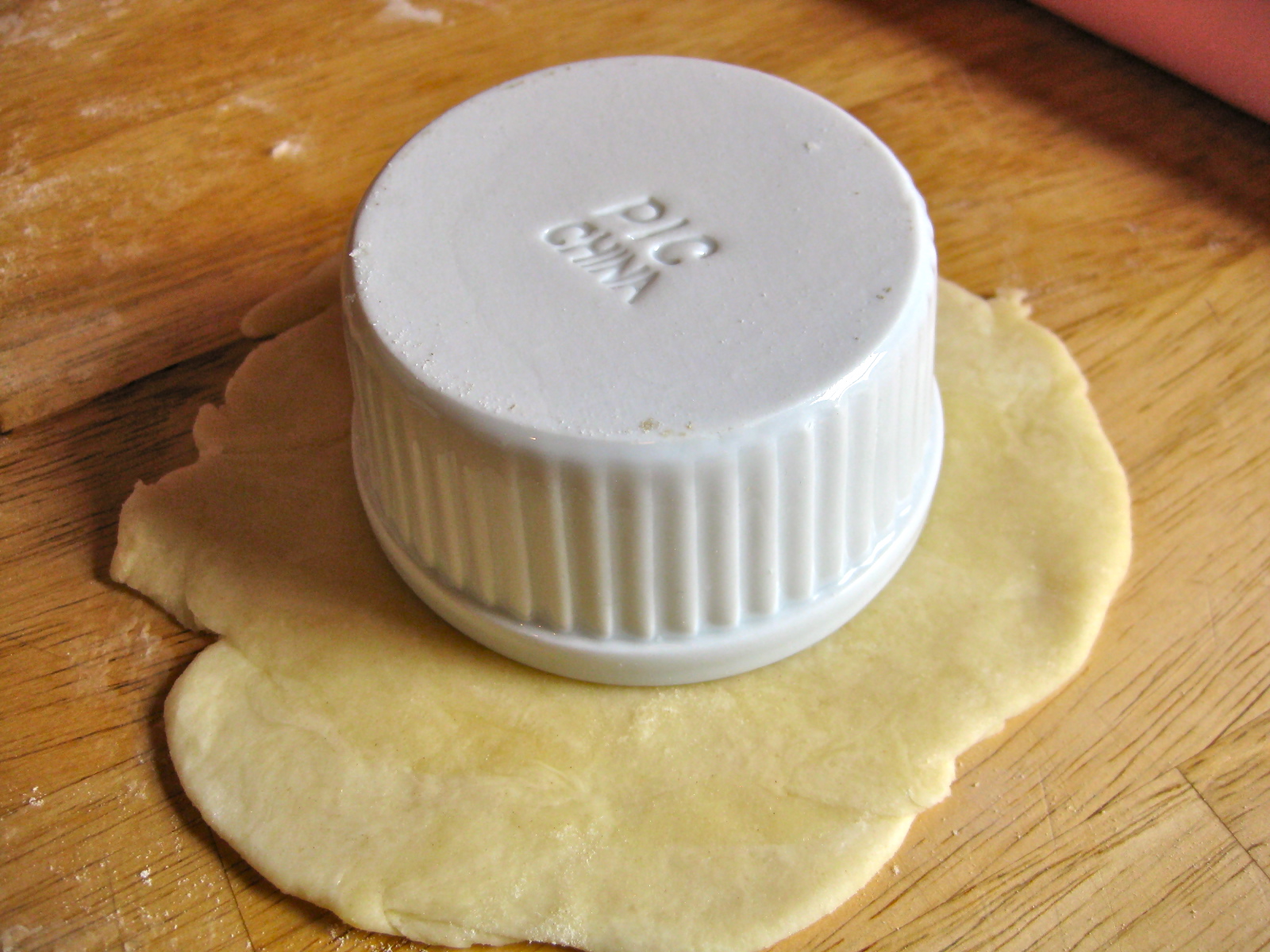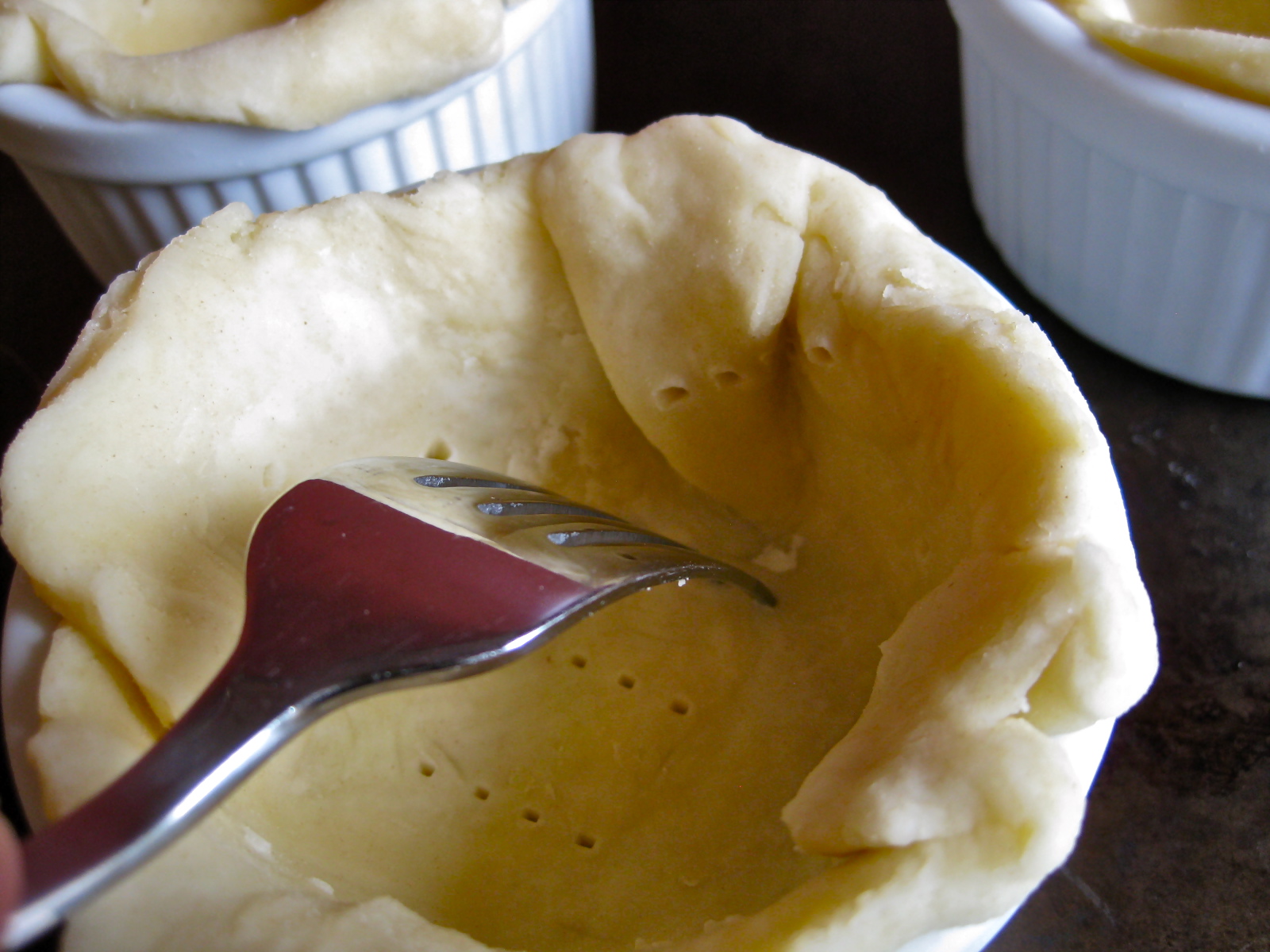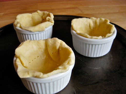 The process could not be simpler. When making a pie, set aside all your errant scraps of pie dough. After you set your pie in the oven to bake, gather together all of your dough scraps and roll them out into a rough circle. Take whatever tiny cup or bowl you would like to use as a little pie plate (here I am using tiny little 4-ounce ramekins), then cut a circle about 2 inches outside the perimeter of the makeshift pie plate. Tuck the circle of dough into your container, gently pressing the dough against the sides and bottom, then use a fork to poke steam holes into the bottom and sides of the dough. Re-roll and re-cut dough until you’ve used up as much of the scraps as humanly possible. It’s up to you if you want to freeze the tiny pie plates at this point (freezing the dough for 30 minutes or so before baking it will prevent a bit of the shrinking that will go on once the dough starts to bake in your hot oven, but it won’t eliminate all of the shrinkage, so I often don’t bother with this step).