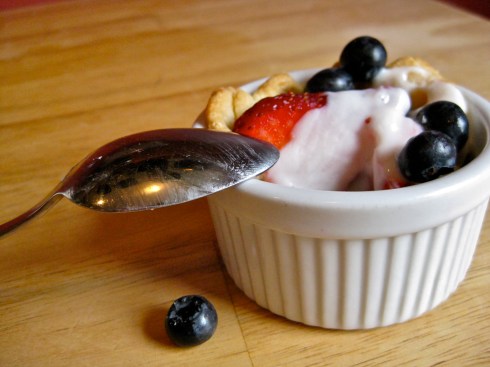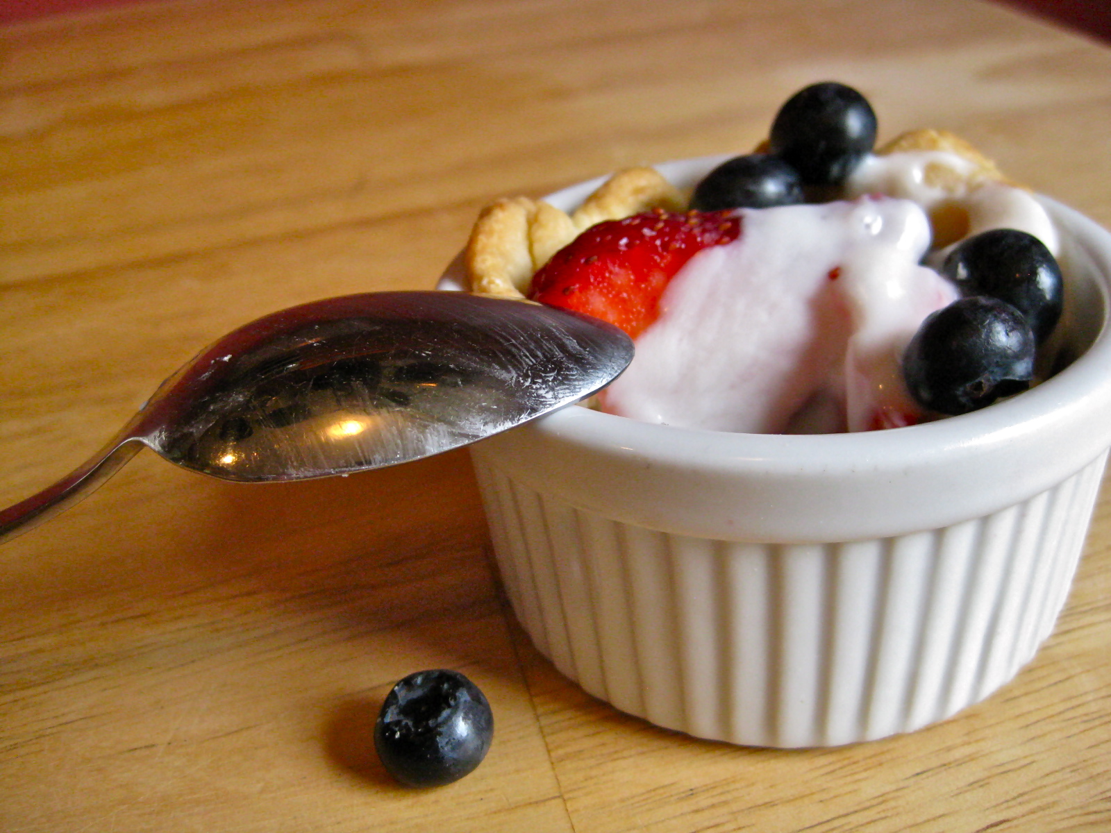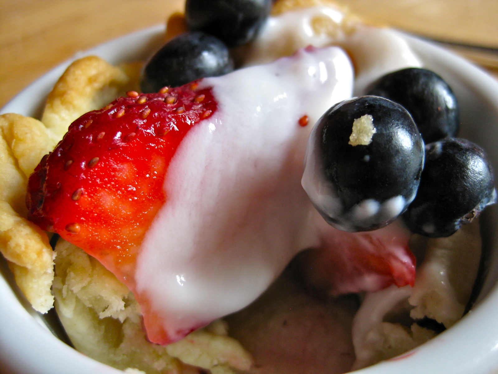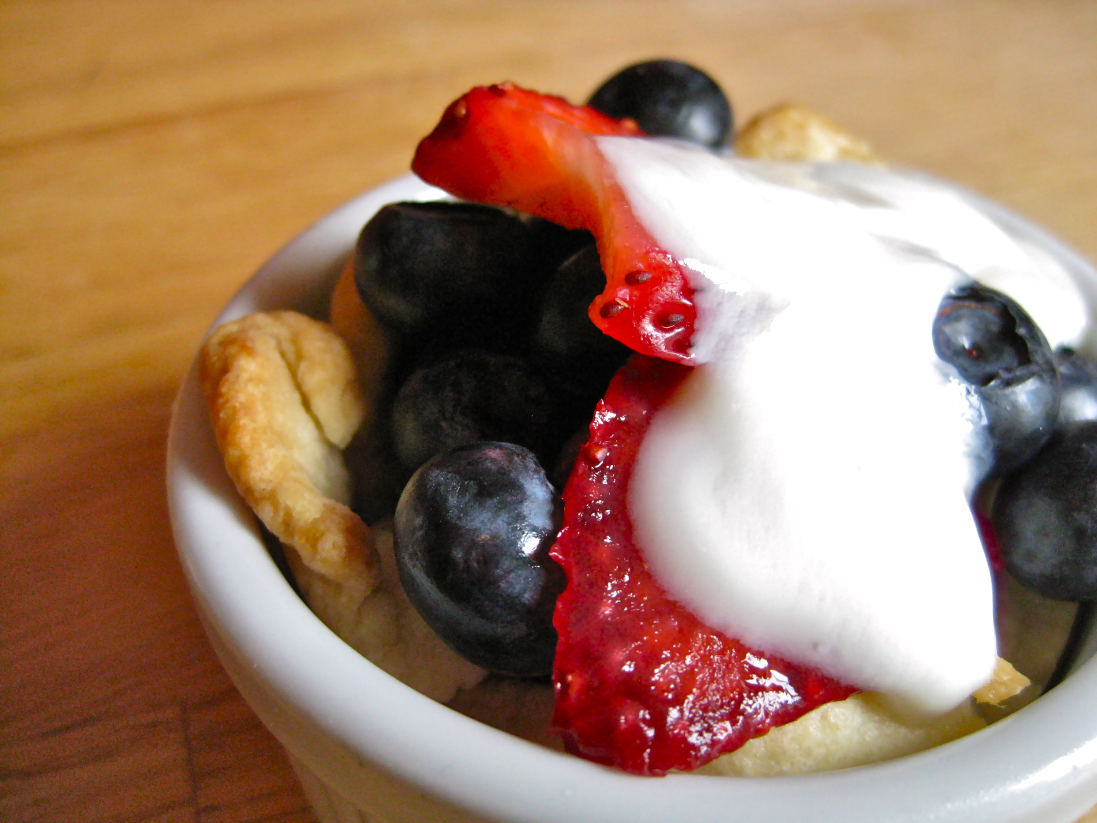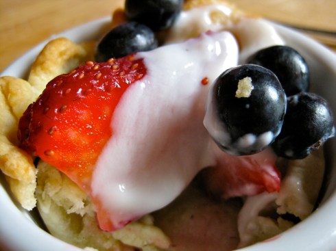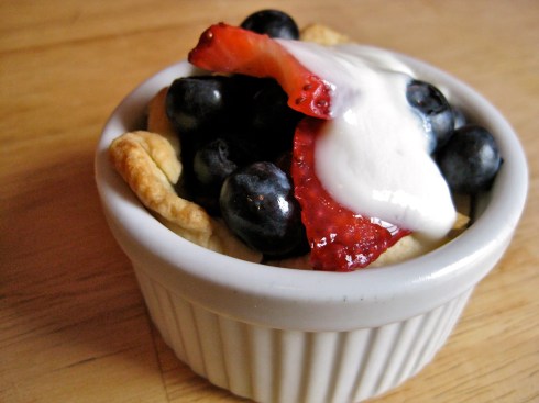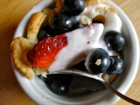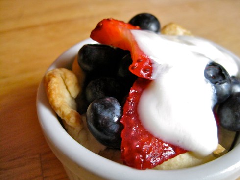 After your crusts have cooled, you can then fill them with pretty much anything you want. Here I have adorned my tiny pie crusts with garden fresh strawberries and blueberries, topped with a bit of vanilla yogurt. This is a heavenly combination, but I imagine pretty much any combination of fruity-plus-creamy would be fantastic. Raspberries topped with a dollop of crème fraiche. Nectarines dotted with whipped cream. Blackberries and custard. Really. There is no way to make this not taste good.