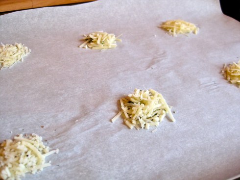 Scoop 1 rounded teaspoon of Parmesan cheese into a little mound on the parchment lined baking sheet. If you want to add rosemary or black pepper to your crackers, sprinkle a pinch of each one onto as many Parmesan mounds as you wish, and gently mix in with your fingers.