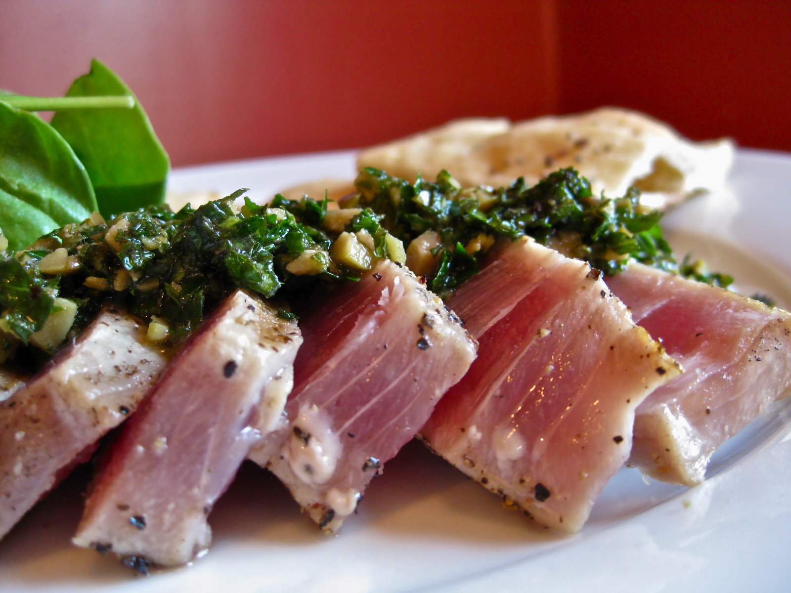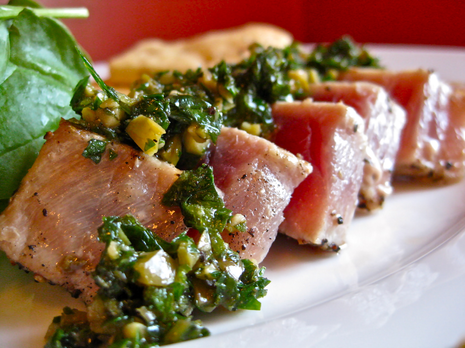To serve tuna, cut each steak, against the grain of the meat, into thin slices. Top with salsa verde.
