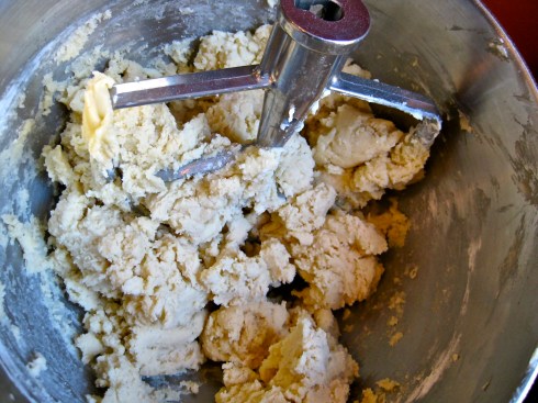 In a mixer fitted with the paddle attachment, combine butter, sugar, and salt, and mix on medium speed until smooth.  Mix in 1 egg until smooth, then mix in the second egg until smooth again.  With the mixer off, scrape down the sides and bottom of the bowl, then add in the flour all at once and mix on low speed until well incorporated.
