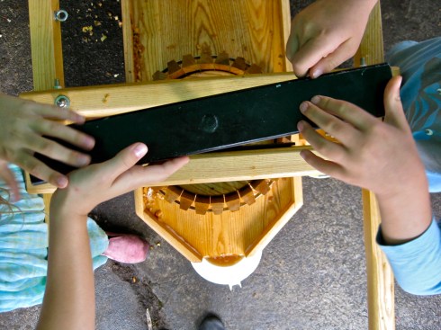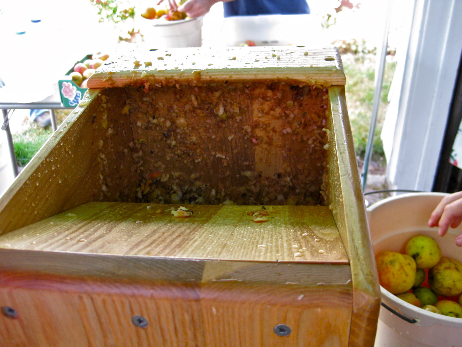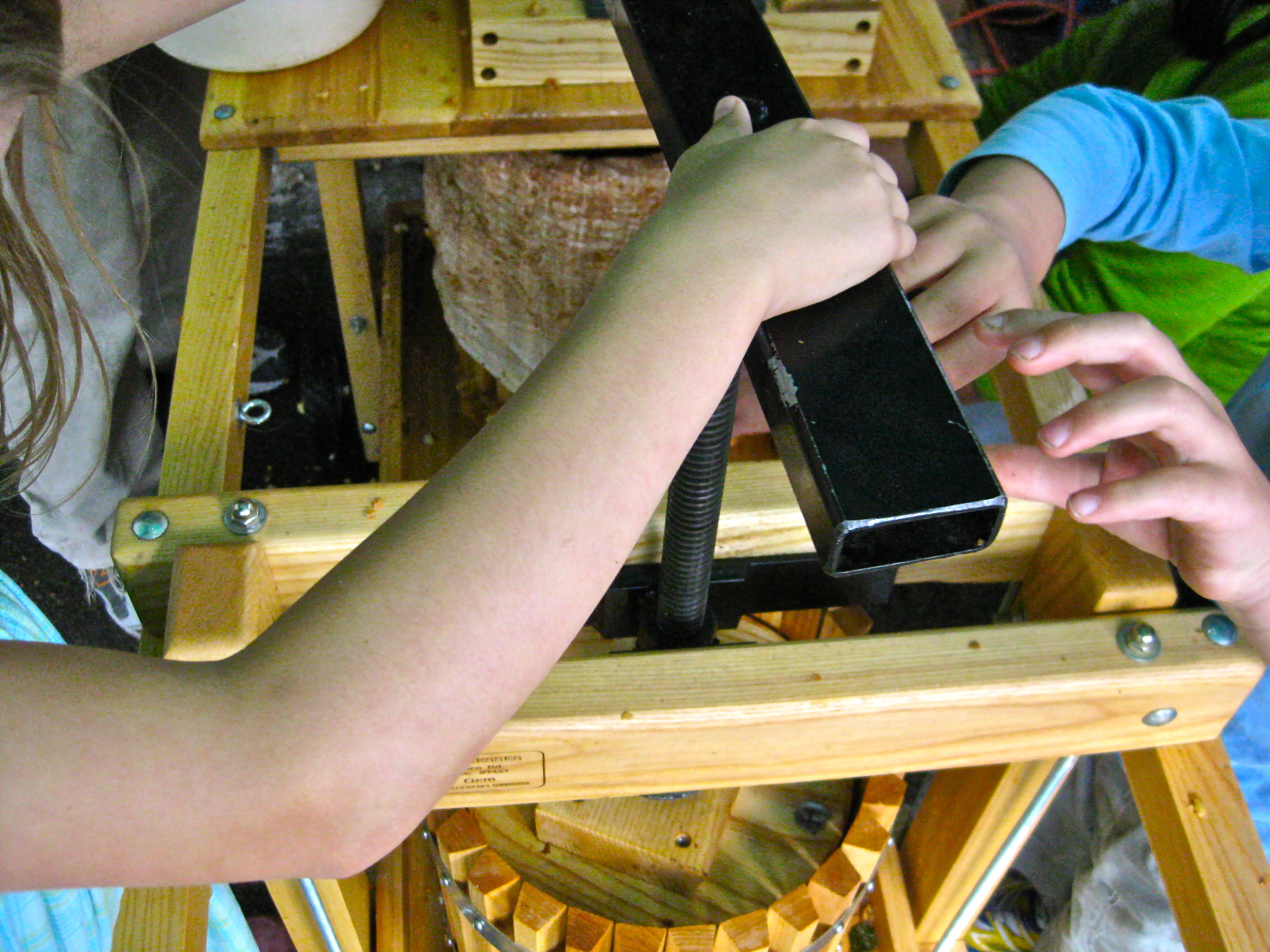 I’m the aunt of the aunt & uncle with the press. We bought it because my husband was so taken with its design – he loves great machinery. This great design is made by Mr. Correll of Correll Cider Presses, 24791 Warthen Road, Elmira, OR 97437. I feel fine about making this ‘product placement’ advertisement, since Mr. Correll is in his 70’s and works out of his modest home, loving his work. Lots of other people love his presses, too, and there was a year’s wait when we ordered ours.