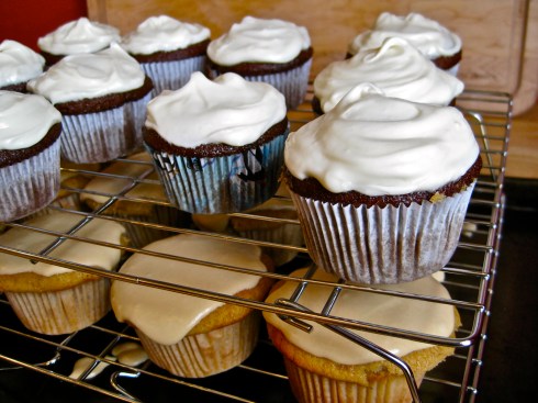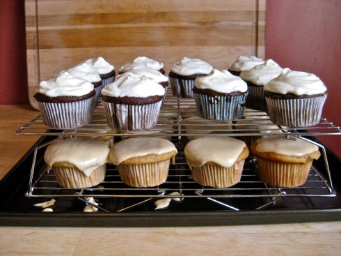 Let’s be honest, even before cupcakes became the dessert de rigueur, then quickly became the most maligned and passé dessert on the planet (oh, how quickly food trends come and go), I think everyone could appreciate how wonderfully portable, casual, and delicious cupcakes are.  You don’t need a plate and fork when you eat a cupcake.  You don’t even need a table or chair, since you can eat a cupcake while walking around, kicking a soccer ball, or simply standing in one place and enjoying the company of friends.  But even better than the fact that cupcakes are handy, simple to make, and adored by children every where, is the realization that when you make cupcakes, you can make many types at a time, which means you can then eat many types, which I totally did, with no shame whatsoever.