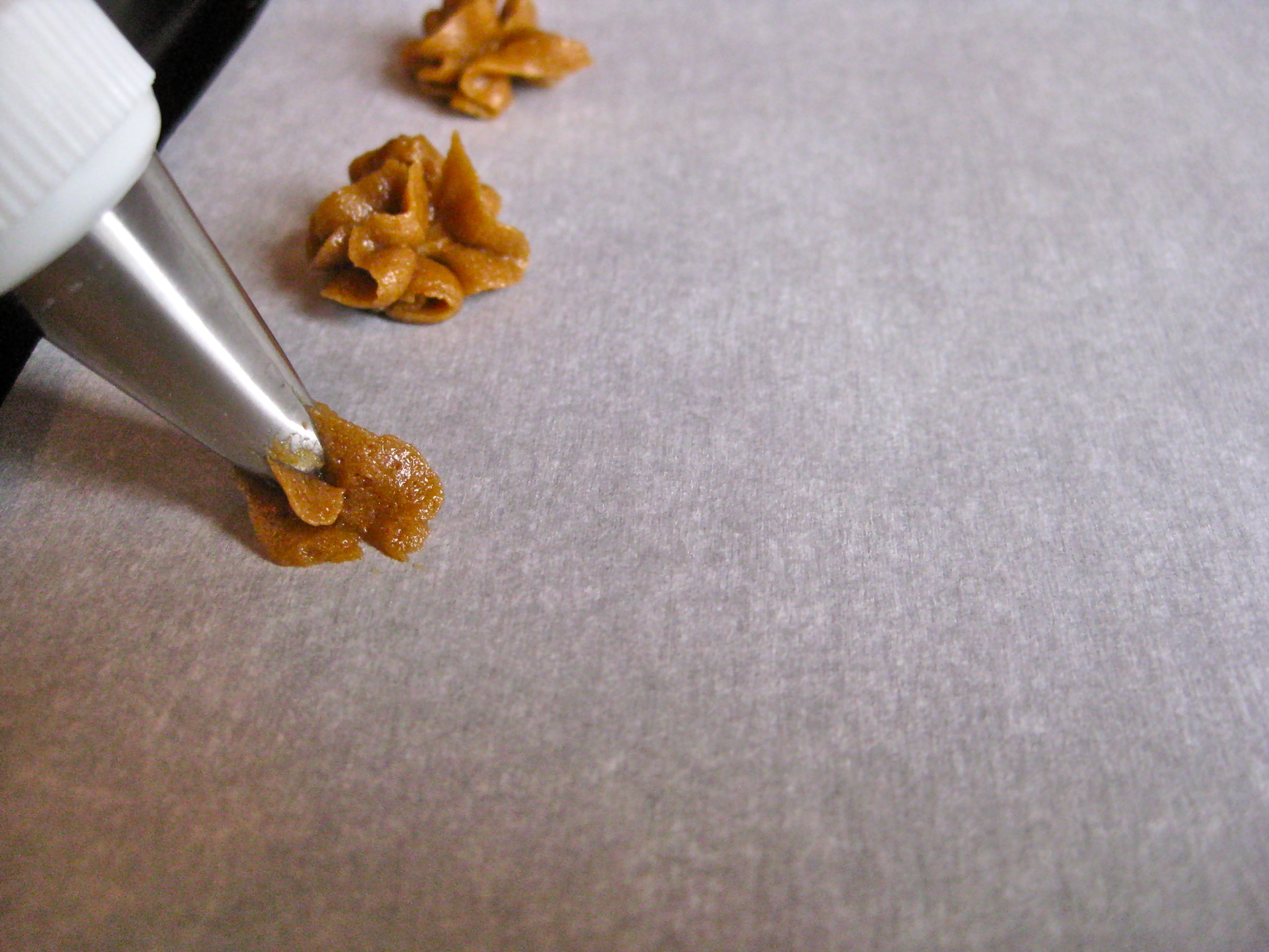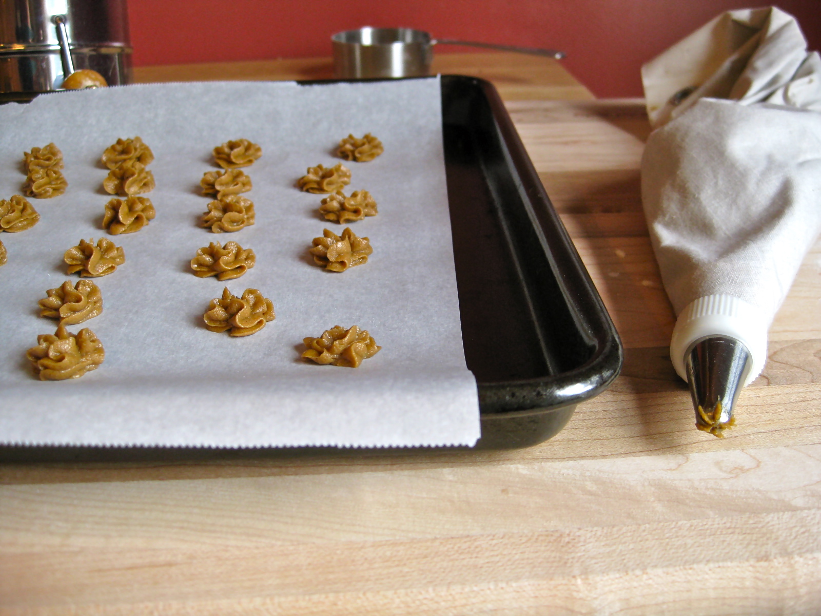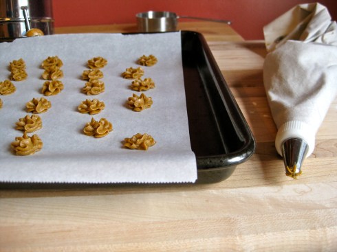 Using a pastry bag or a Ziploc bag with a bottom corner cut off, pipe or squeeze out cookies onto a parchment-lined baking sheet in approximately ¼ teaspoon portions (if your squeezes turn out marginally larger, don’t worry).  Place each cookie about 1 inch apart, lest they stick together as they spread during baking.