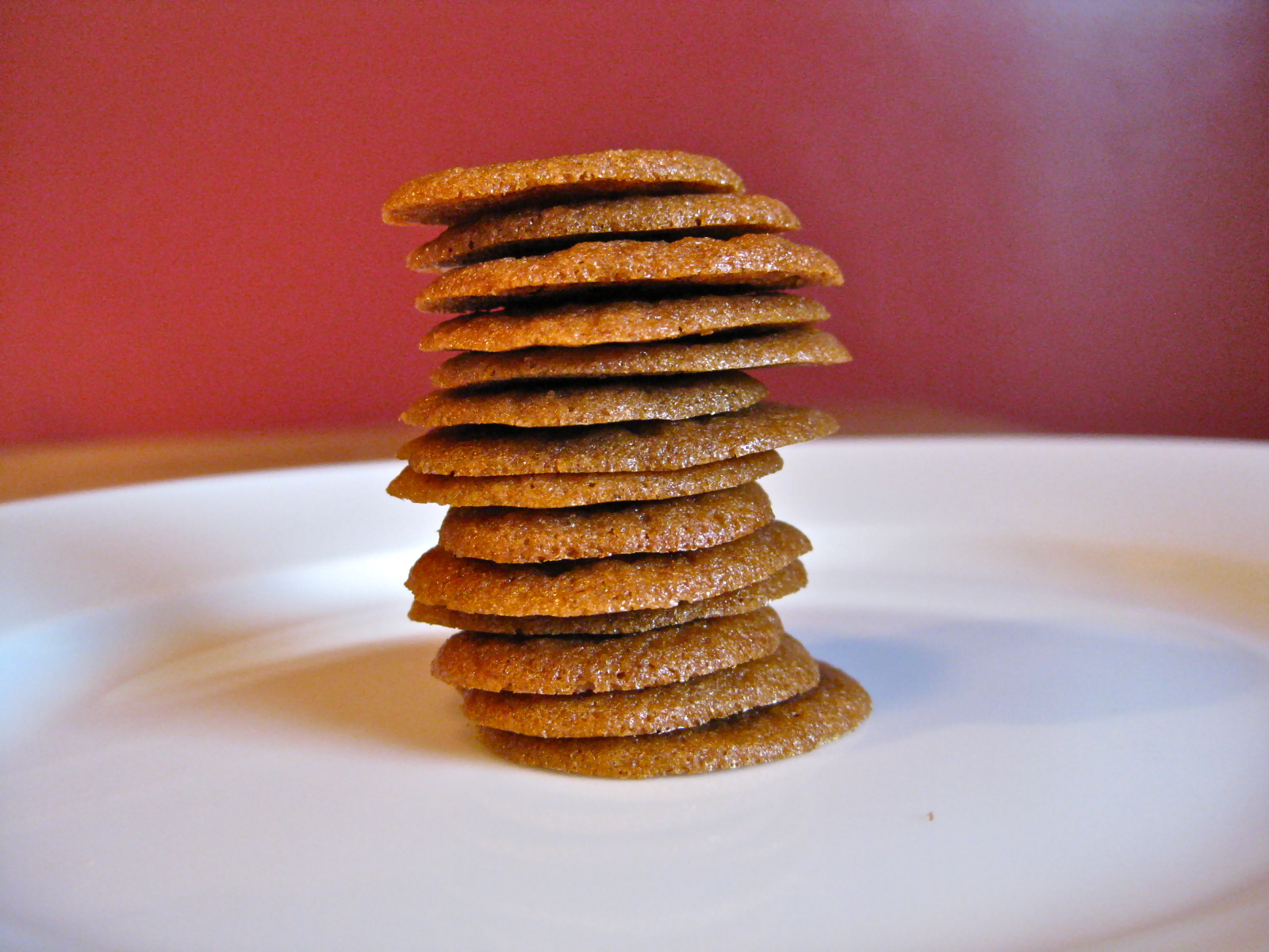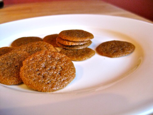 Okay, so I didn’t get a chance to make these until this afternoon (2 weeks after I said I would), and I realized when I started baking that I didn’t have any parchment paper. After a quick consultation with a trusted baker I decided to go ahead and make them. They are so delicious. I baked them for 6 minutes because I planned on leaving them to cool on the sheet. I baked them on a buttered air baking sheet and let them cool for about 4 minutes on the baking sheet before removing them with a very thin metal spatula/turner. A couple of them were a little overly crisp at the edges and shattered a bit and a few accordion folded as I tried to get under the edge – I just had to eat those because I’m taking the rest to a pot-luck dinner. They are insanely delicious! Thanks for sharing this great recipe.
