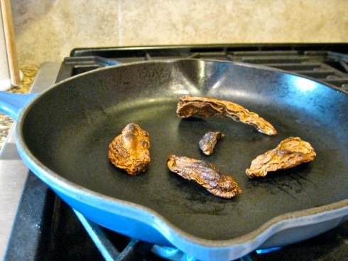In an ungreased skillet set over medium heat, toast the chiles, stirring for a minute until they are aromatic and start to develop little darkened spots on them.  Transfer to a bowl, cover with very hot water, and rehydrate the chiles for 30 minutes.