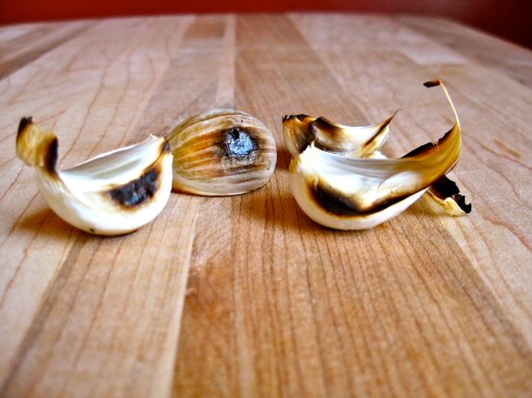 In the same skillet, roast the garlic, turning frequently, until soft and blackened in places, about 15 minutes.  Allow to cool slightly, then remove the papery skins.