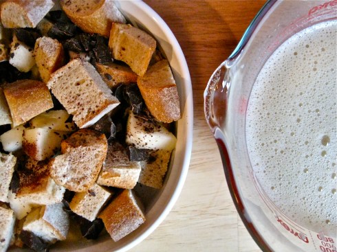 Do you believe that the subconscious can really drive one’s actions? That inclinations deep inside you can dictate your unwitting behavior? Sometimes I really do wonder, most pointedly because lately, completely contrary to what had previously passed as the norm around here, I have been leaving loaves of delicious, crusty bread out on the counter, allowing them to become stale beyond the limits of standard consumption. But then, stale and slightly dry, what do they then magically transform into? Perfect bread for bread pudding, that’s what.