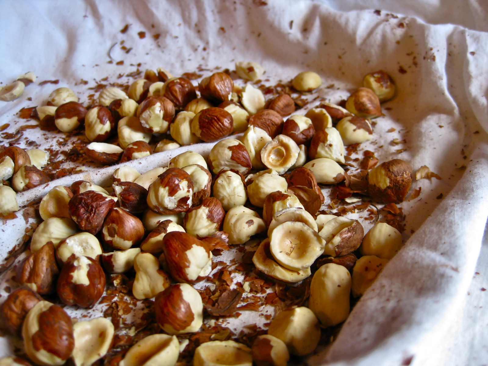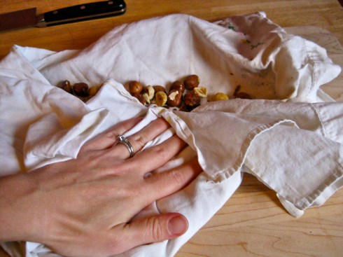Place hazelnuts on a baking sheet, and toast for 10 to 15 minutes, until you see the skins begin to curl up slightly and come loose. Place the nuts in a clean dish towel, fold the towel over the nuts, and vigorously rub the towel around, sloughing loose the hazelnut skins. Continue to rub the hazelnuts in the towel until most of the skins have come free. It is perfectly fine if some skins remain intact. Very coarsely chop hazelnuts, mostly to cut them in half, then set aside.