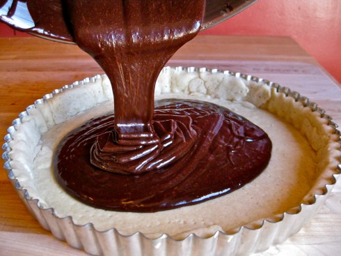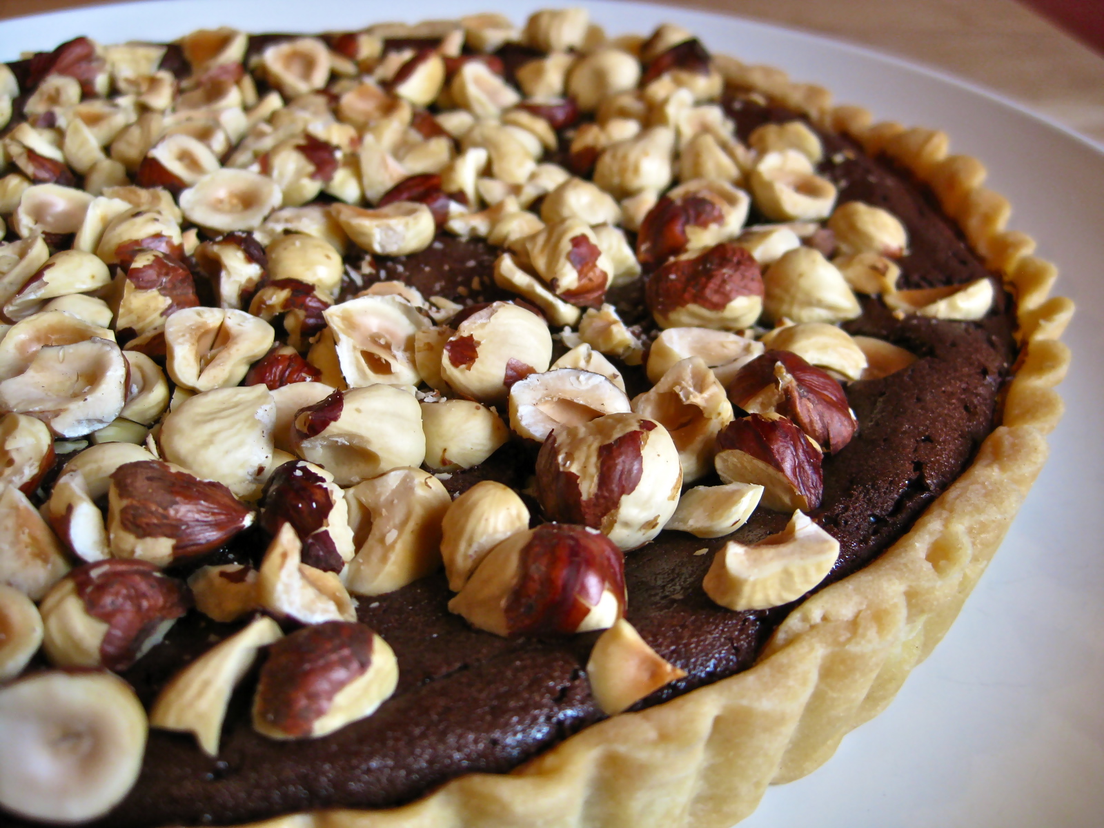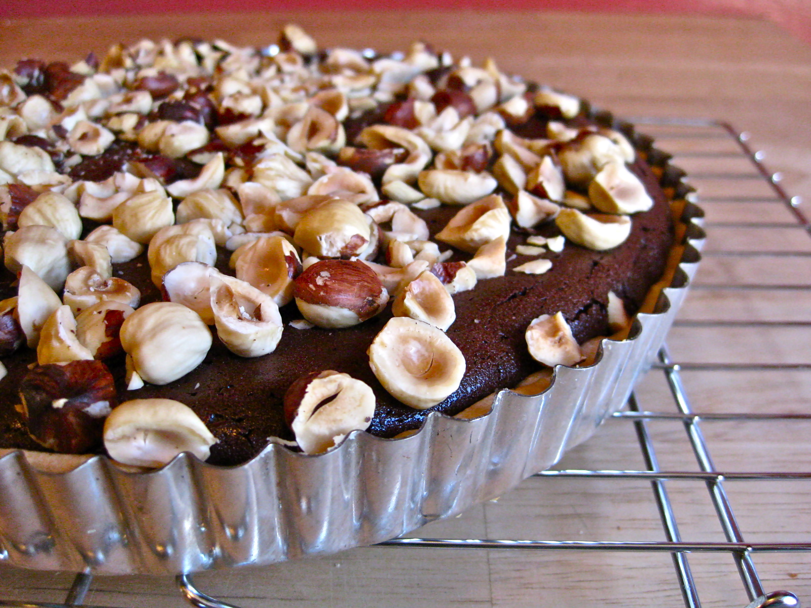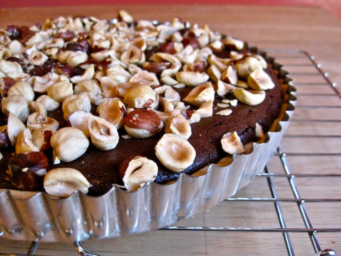 Pour chocolate mixture into the parbaked tart shell. Place tart on a baking sheet, and bake in the middle of the oven for 20 minutes, until the chocolate filling has just begun to set. Remove the tart from the oven while still on the baking sheet, scatter the hazelnuts over the top of the partially baked tart, press them very gently into the filling, then return to the oven to bake an additional 15 minutes, until the edges of the tart appear a bit dry and have started to crack.