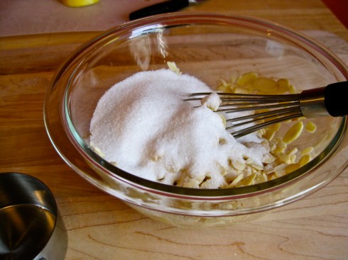 To make the topping, combine the almonds, sugar, egg whites, and salt in a small bowl.  Stir well to combine.  Spread the almond mixture evenly over the pears, extending the topping all the way to the edges of the tart.
