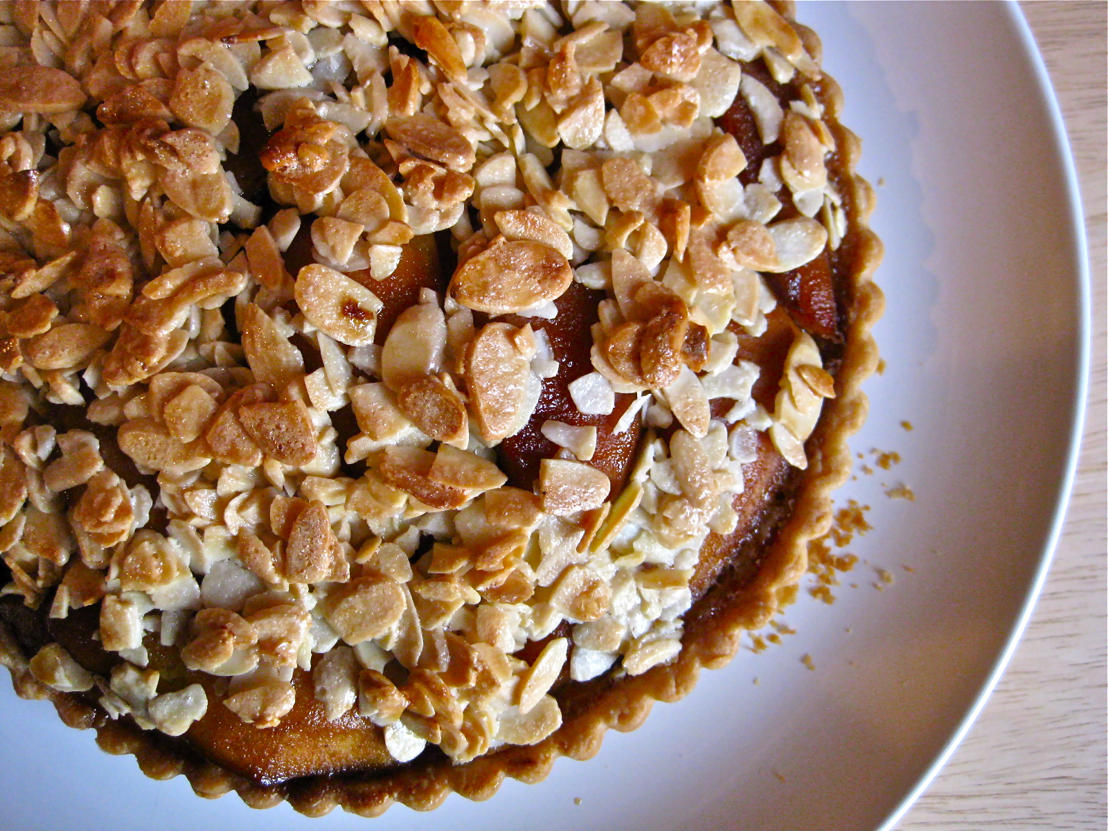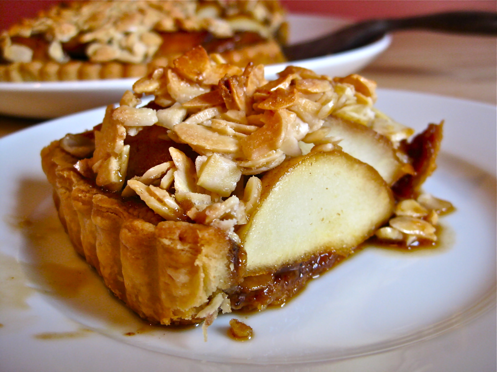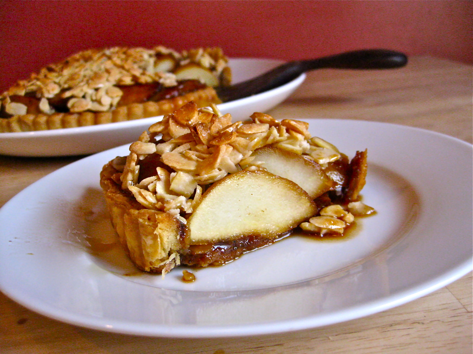 Because of this, I actually debated whether or not to share my experience with this recipe, not being sure if I wanted to highlight something that I thought needed its sweetness dialed back so severely.  In the end, realizing that the rest of the recipe is fairly delightful, it seemed like the recipe did need to be shared, albeit in a somewhat less-sweetened form.  And even though I swapped out the original recipe’s call for apples with my own penchant for pears, and I ever-so-slightly altered the pears’ cooking method in order to get a more usable sauce in the end.  Okay, so there is a fair amount that I changed about this recipe, but only because I had a hunch that what I found to be almost perfect could, with a bit of fiddling, be made to shine.  And at the risk of sounding like a weird pageant mom, I think that bit of polishing has rendered this tart now ready for its close-up.