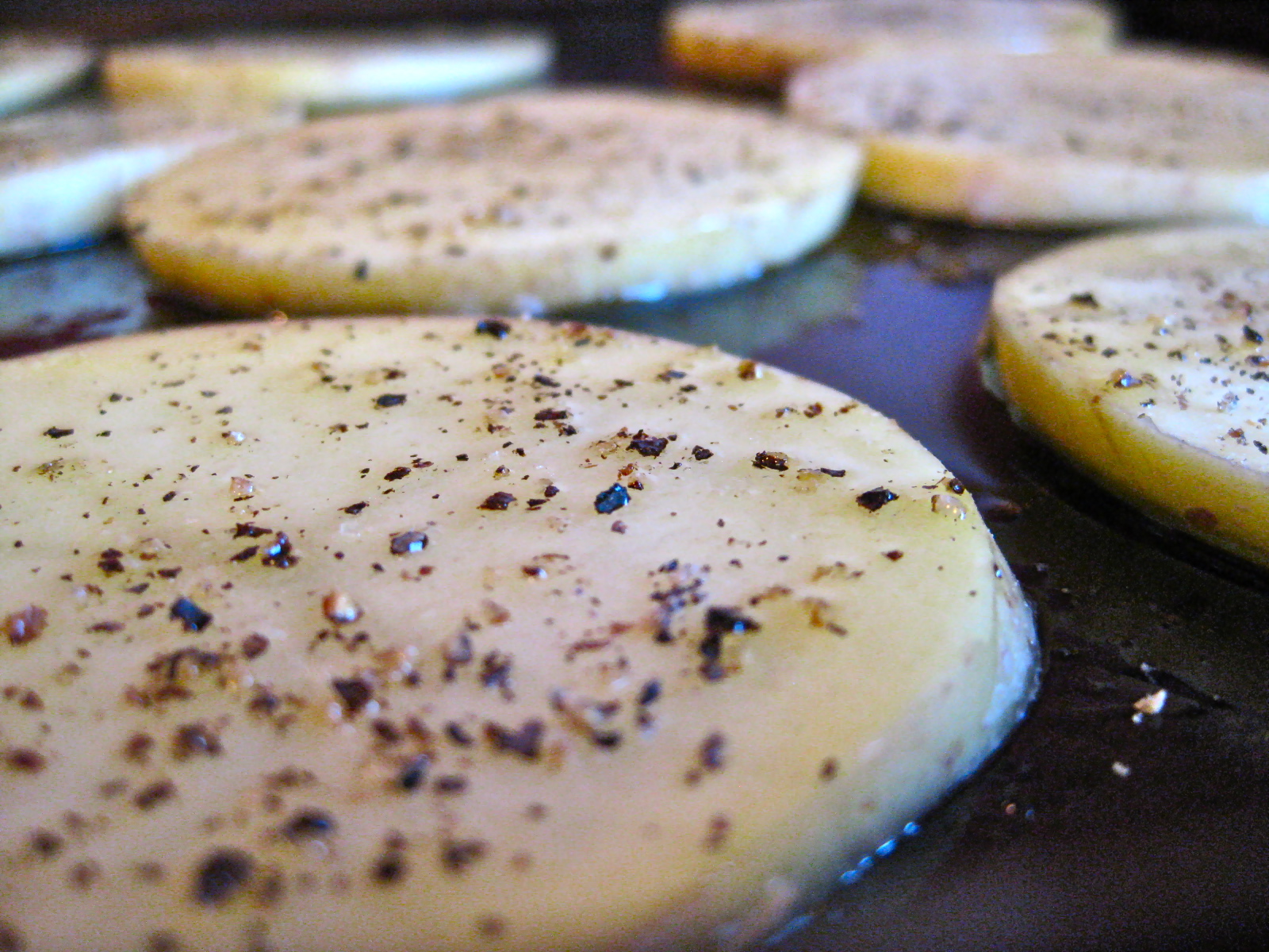 Slice potatoes into ¼-inch rounds. You can use a mandoline slicer to do this, but I find that a very sharp knife works just fine. Divide the olive oil between two baking sheets, drizzling the oil over as much of the surface as possible. Arrange the potato slices on the oil baking sheets, turning the potato slices over and moving them along the surface of the baking sheet to make sure each slice is well oiled on each side. Sprinkle the potatoes with salt and pepper. Bake the potato slices for 25 minutes, flipping each potato slice halfway through, and also swapping the positions of the baking sheets (so the bottom one is now on top, and vice versa).