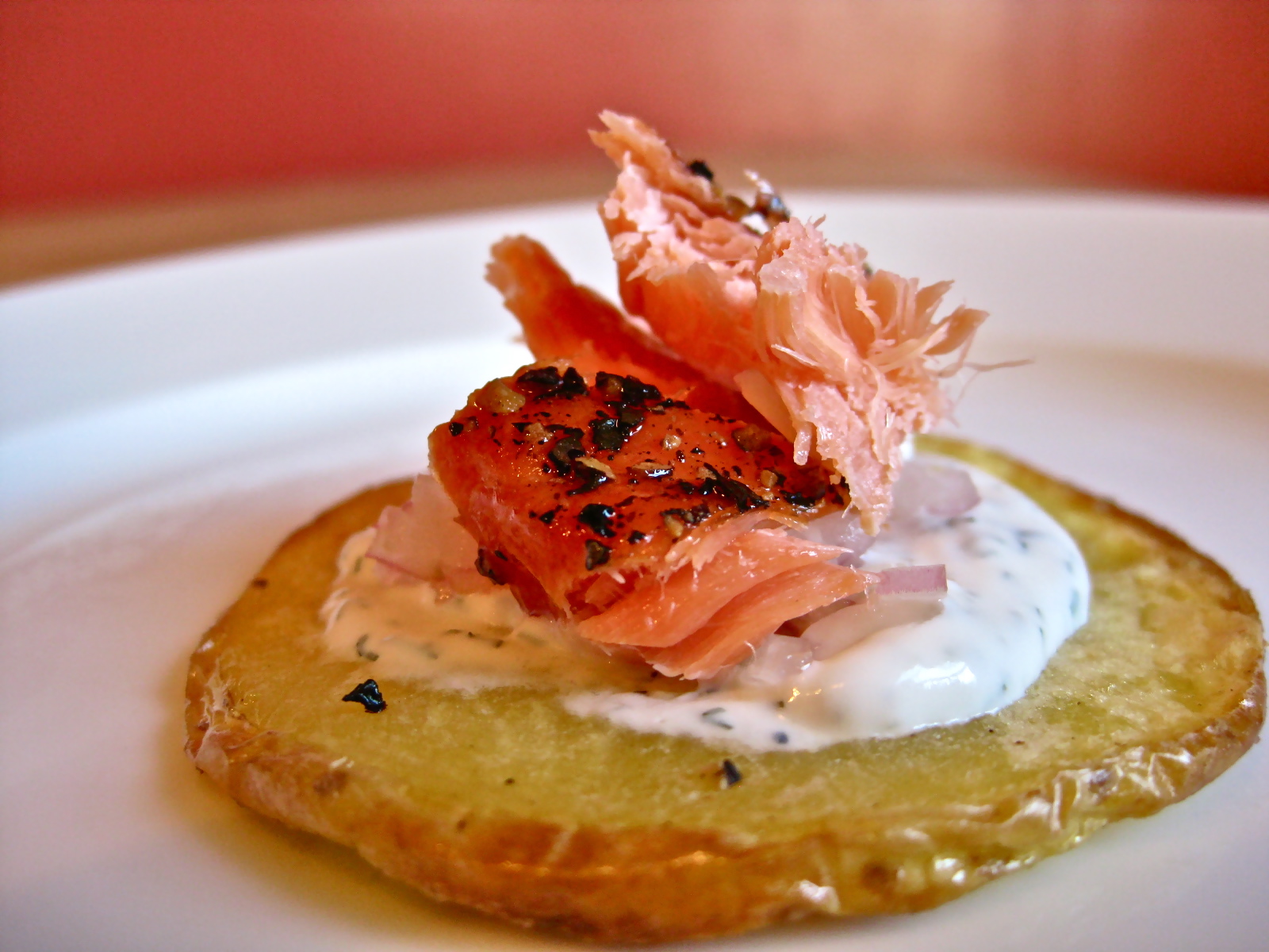 To assemble a canapé, place a small amount of dill spread on top of a cooled potato crisp. Top the dill spread with a small dollop of shallot relish. Place a chunk of smoked salmon on top of the relish.