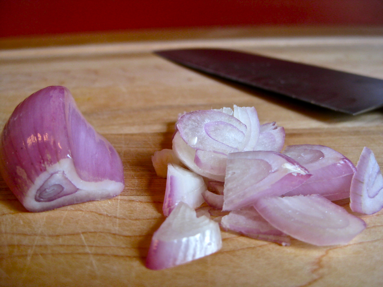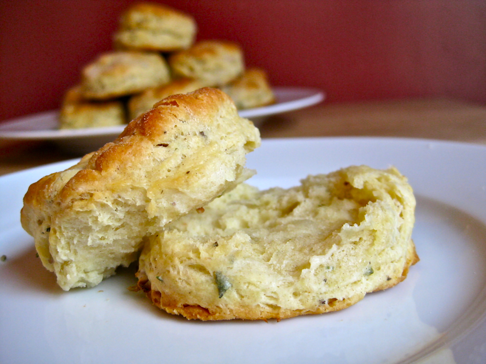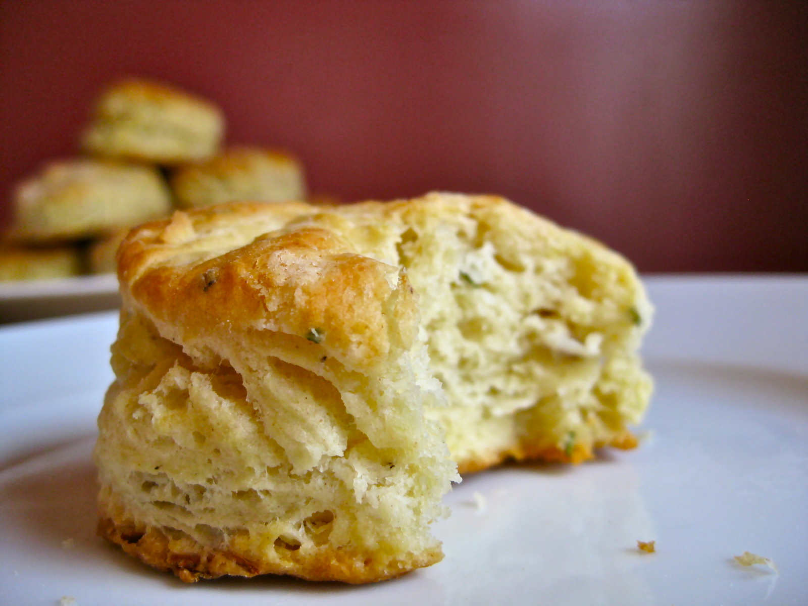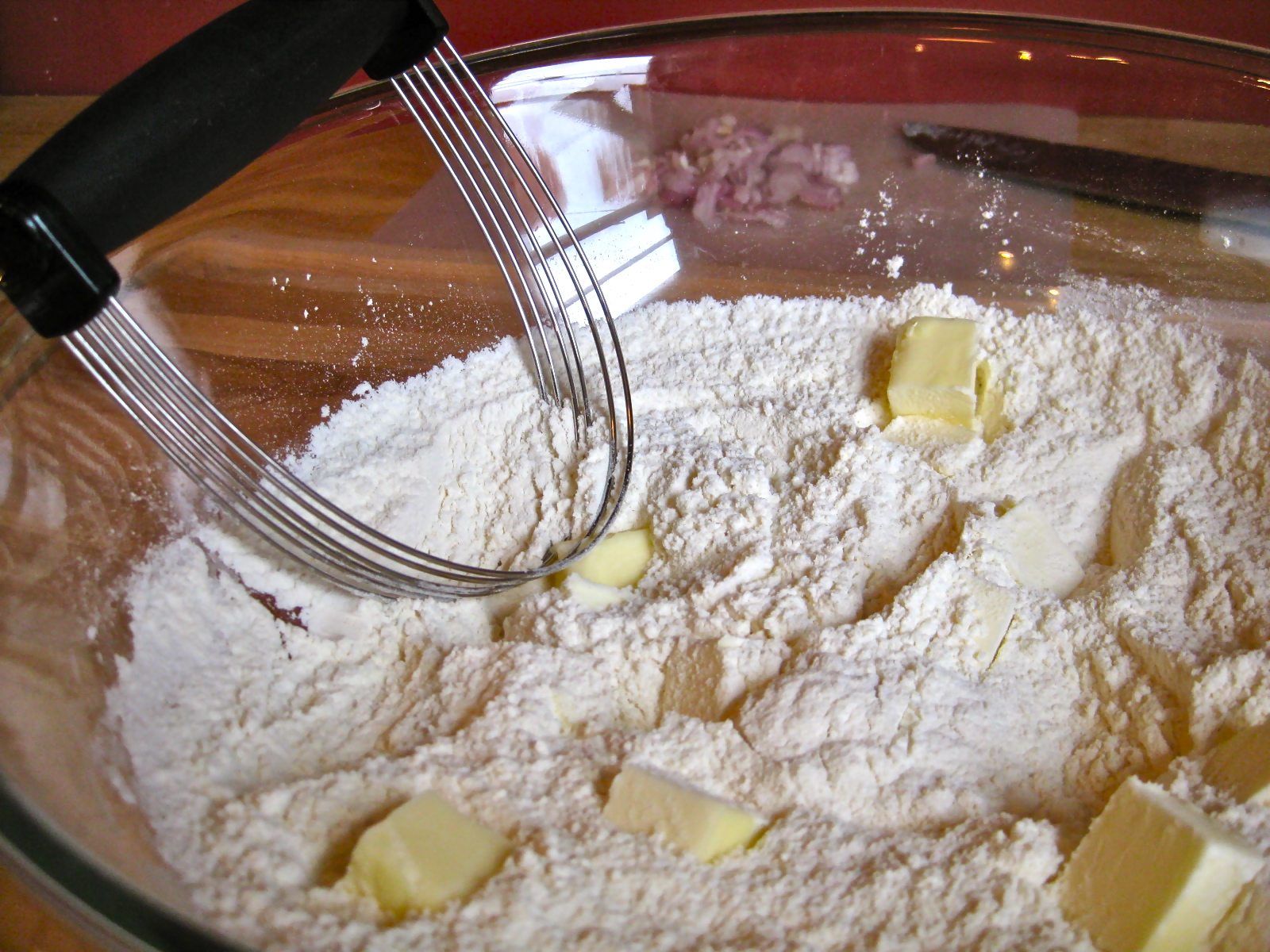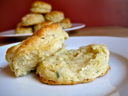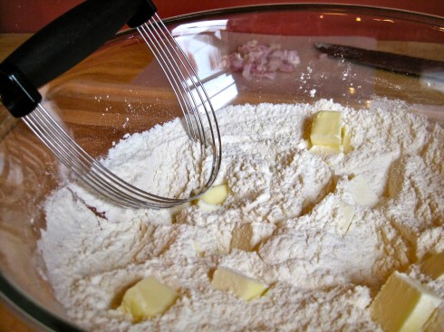 Previously, I have used this base recipe to make blueberry biscuits, a perfect snack or breakfast treat, but the last time I made biscuits, I was in the mood for something a bit more savory.  I threw in what were quite literally some leftover items sitting on a kitchen counter (half a large shallot, some stray herbs), and in just a few minutes I was pulling a pan of delicious biscuits out of the oven.  My kitchen was cozy and warm, the biscuits flaky and satisfying.  Who needs to turn up the thermostat when you’ve got fresh biscuits?