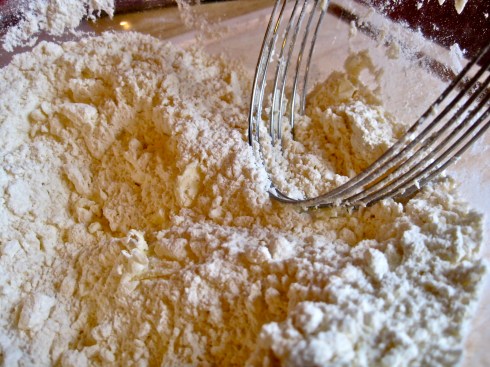 Add the egg and buttermilk mixture to the flour and butter mixture, stirring just to moisten the ingredients.  The dough should appear shaggy, but not sticky.
