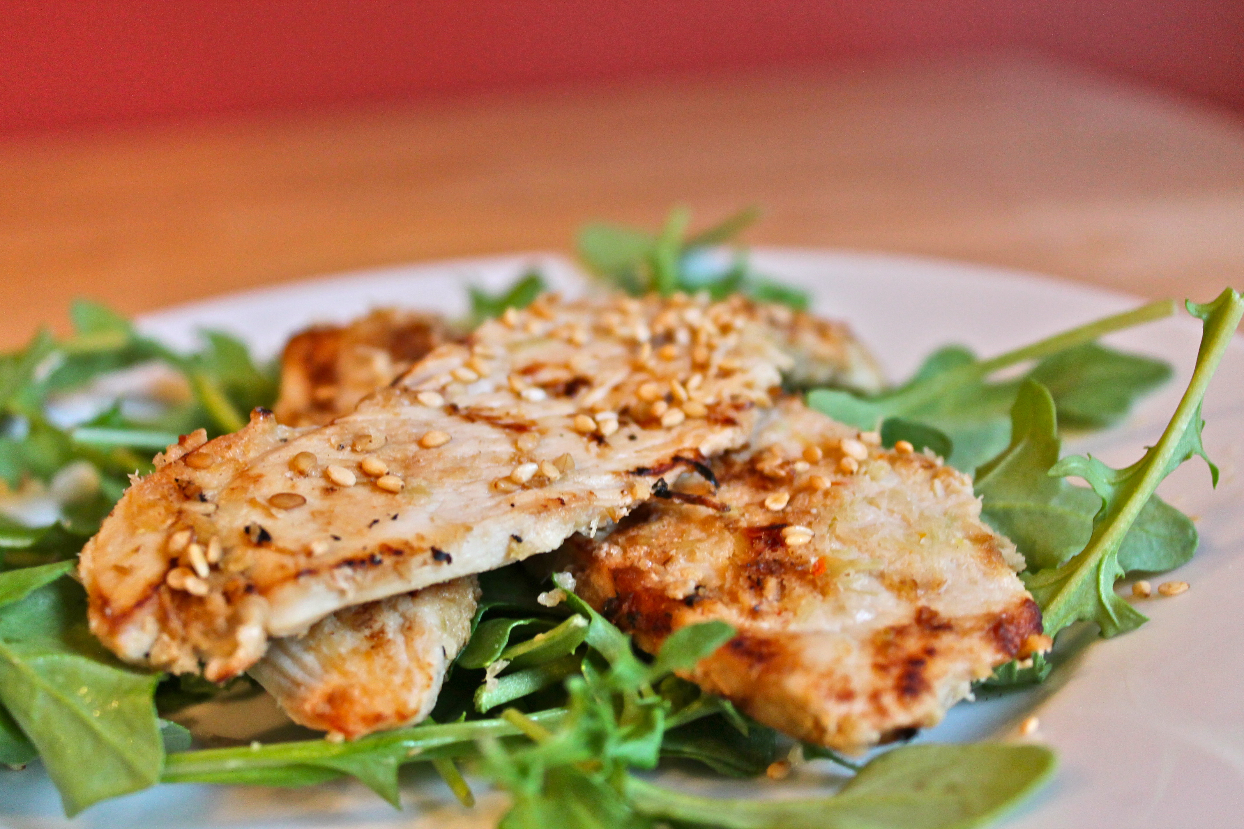Prepare a grill, grill pan, or broiler on medium high heat. Sprinkle the meat with sesame seeds, then grill or broil until cooked through, about 2 minutes for the first side and 1 minute for the second side, depending on how hot your grill or broiler is and how fast the chicken is cooking through.