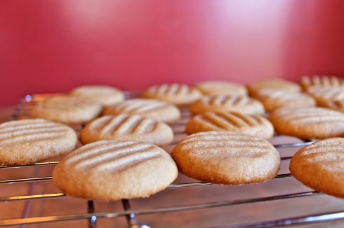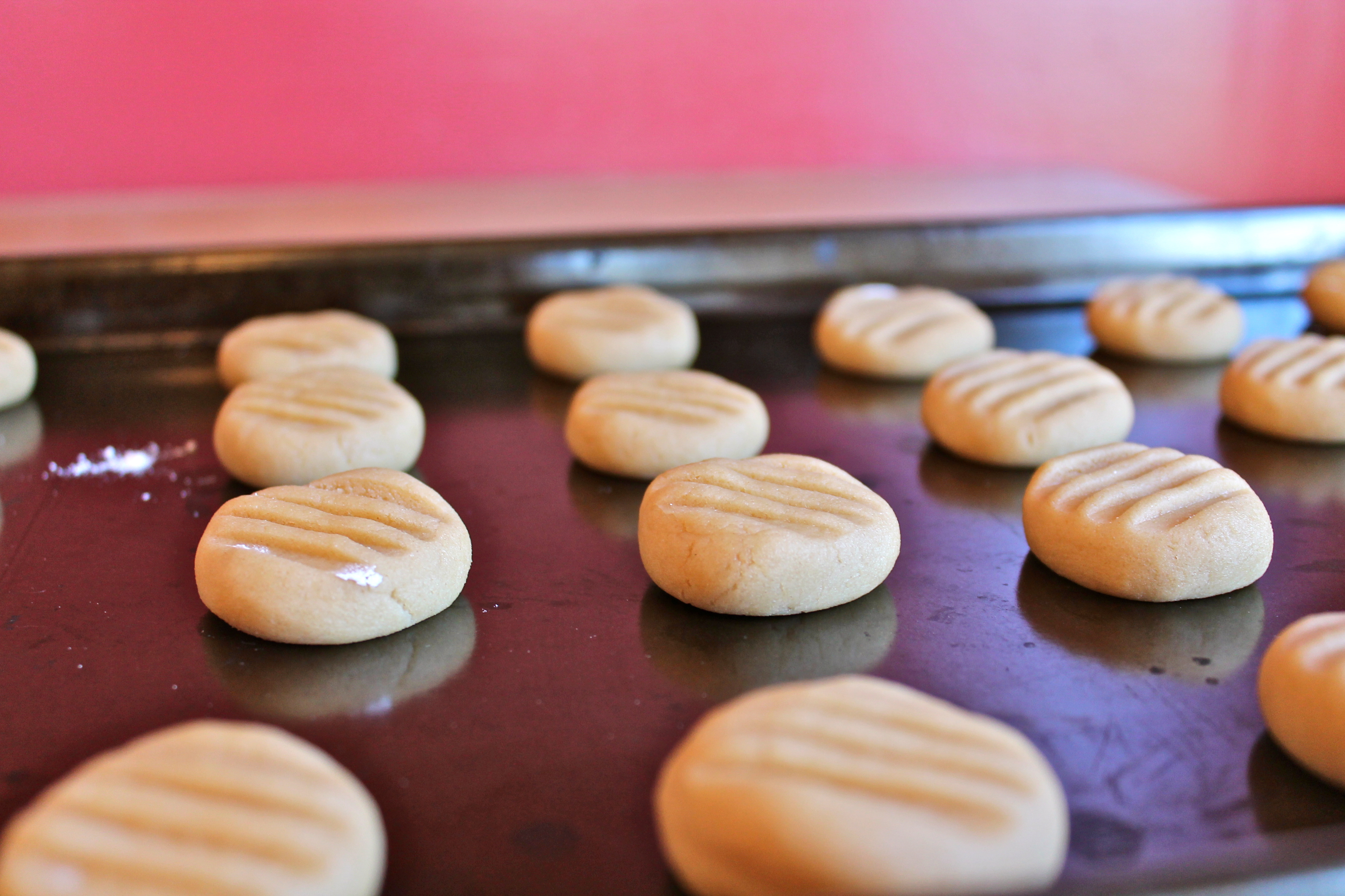 Shape roughly 1 heaping teaspoon of dough into 1-inch balls, rolling the dough in between your hands. Place dough 1 ½ to 2 inches apart on an ungreased cookie sheet. With a fork dipped in flour, flatten each dough ball into a 1 ½-inch round.