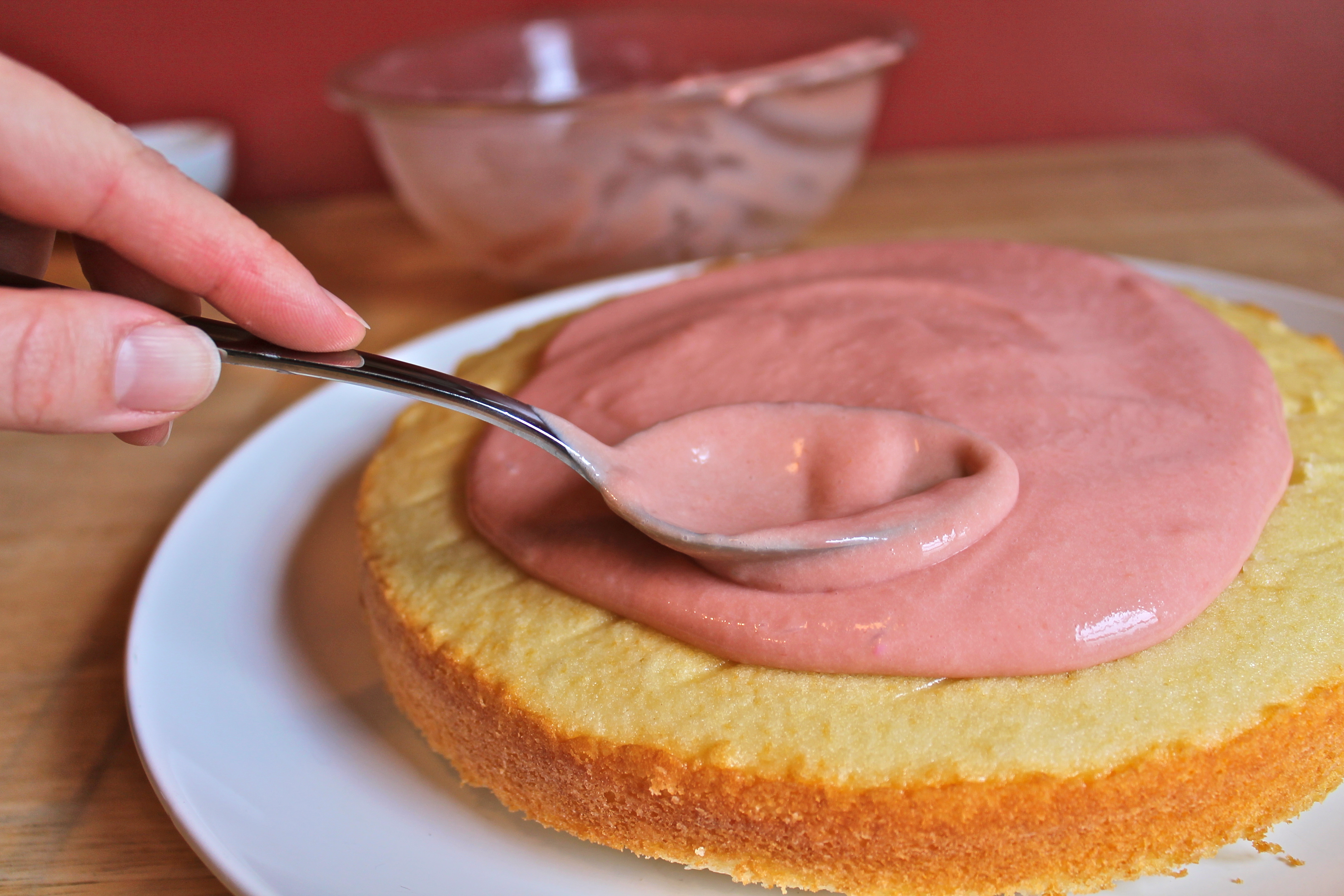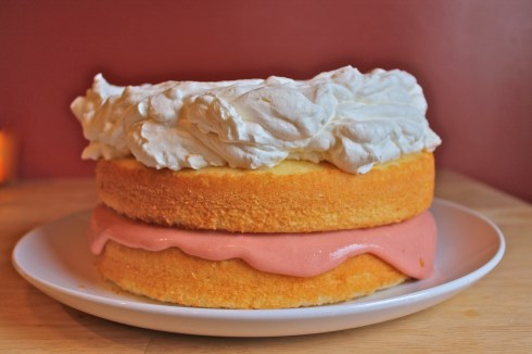A fortuitous discovery of this great recipe for orange curd via The Kitchn made me all the more excited to dress up this cake of choice.  The fact that blood oranges are so wonderfully in season made me giddy with anticipation.  In my mind, I was envisioning a bright orangey-red filling, a sweet and tart balance to the rich and buttery layers of cake nestled above and below.  As you can see, my vision was not entirely fulfilled.  Yes, the blood orange curd was delicious—as tart and creamy as I could ever hope for—but, clearly, what you see before you is not so much bright or intense in hue, but rather what I can only brand as being “Barbie-worthy.”  Entirely by accident, I managed to construct a pink princess cake.  Pardon me, a delicious pink princess cake.