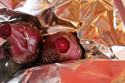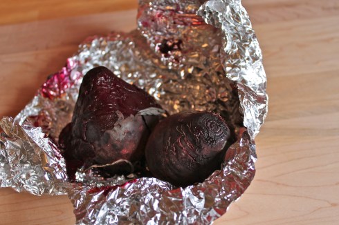 Preheat oven to 375 degrees Fahrenheit.  Wrap beets tightly in foil.  Roast beets for 40 minutes, until cooked completely through.  Remove from oven and carefully unwrap to allow steam to escape, then leave beets—still in foil—to cool.  When beets have cooled enough to touch (about 15 minutes) rub the beets in their foil wrapper to remove skins.  Voila—you have just avoided staining your hands with the diabolically stubborn juice of your beets.