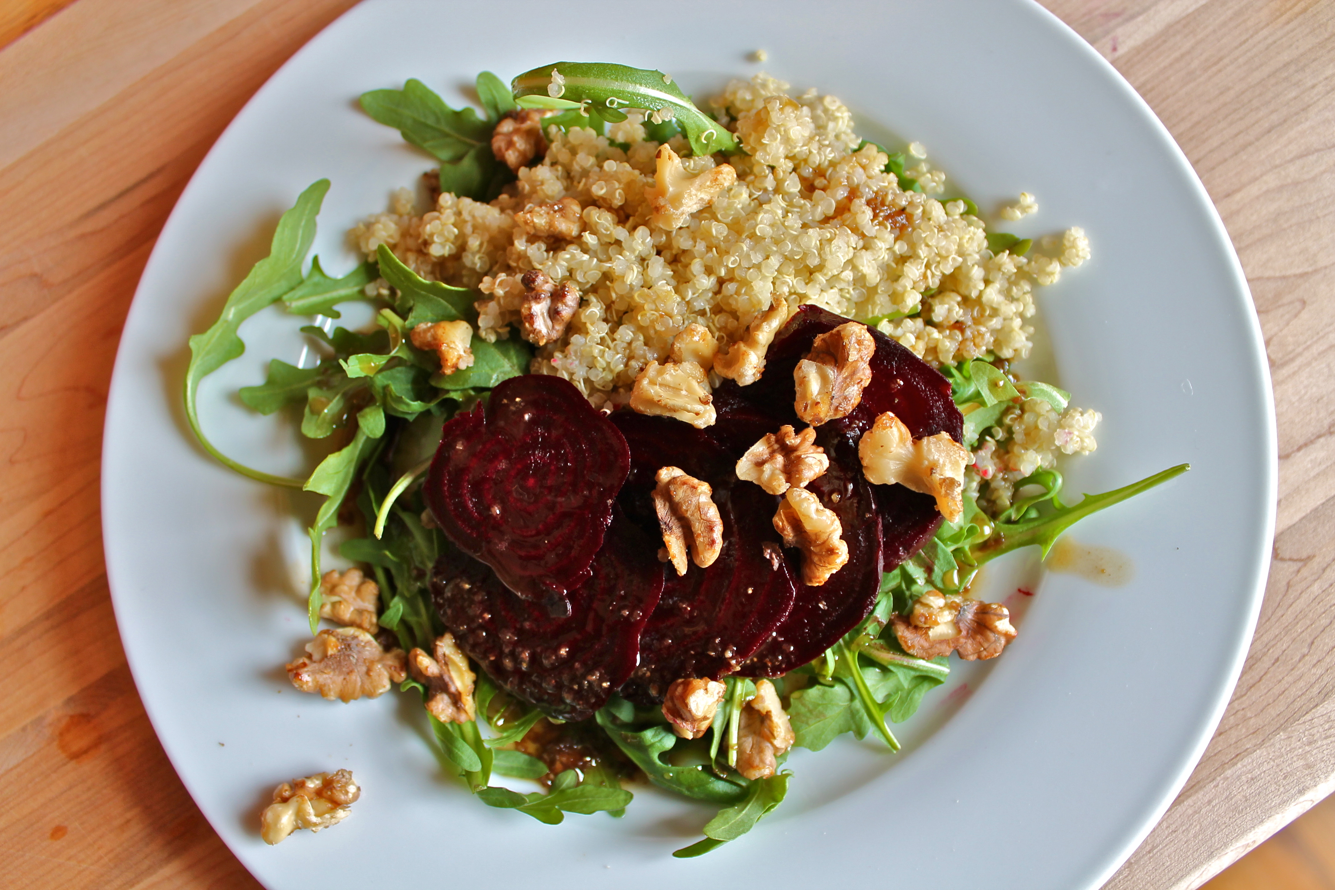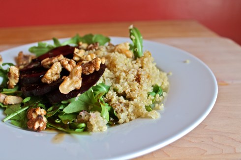 If I were to choose a salad to eat every day, perhaps even at every meal, it would be this one.  Nutty quinoa piled on top of crunchy, spicy arugula, earthy roasted beets, a handful of toasted nuts with just a hint of sweetness, and a kicky, citrusy dressing, all together on one plate.  This is my favorite whole-meal salad.  Unfortunately, it is also the salad that contains every single ingredient that my son finds absolutely repellant (save for the sweetened walnuts), so it is a salad that I tend to consume only when I know that I will be eating alone, and thus in charge of pleasing only myself.  It is my hope that my son will one day discover the joys of beets and quinoa (or, shall I say, rediscover, since that kid ate both of those things when he was a baby, but won’t go within five feet of them now, of course—not that I am trying to make him feel guilty or bad or…where was I going with this?), but if he does not, maybe that’s not entirely awful since, of course, less salad for him logically means more salad for me.