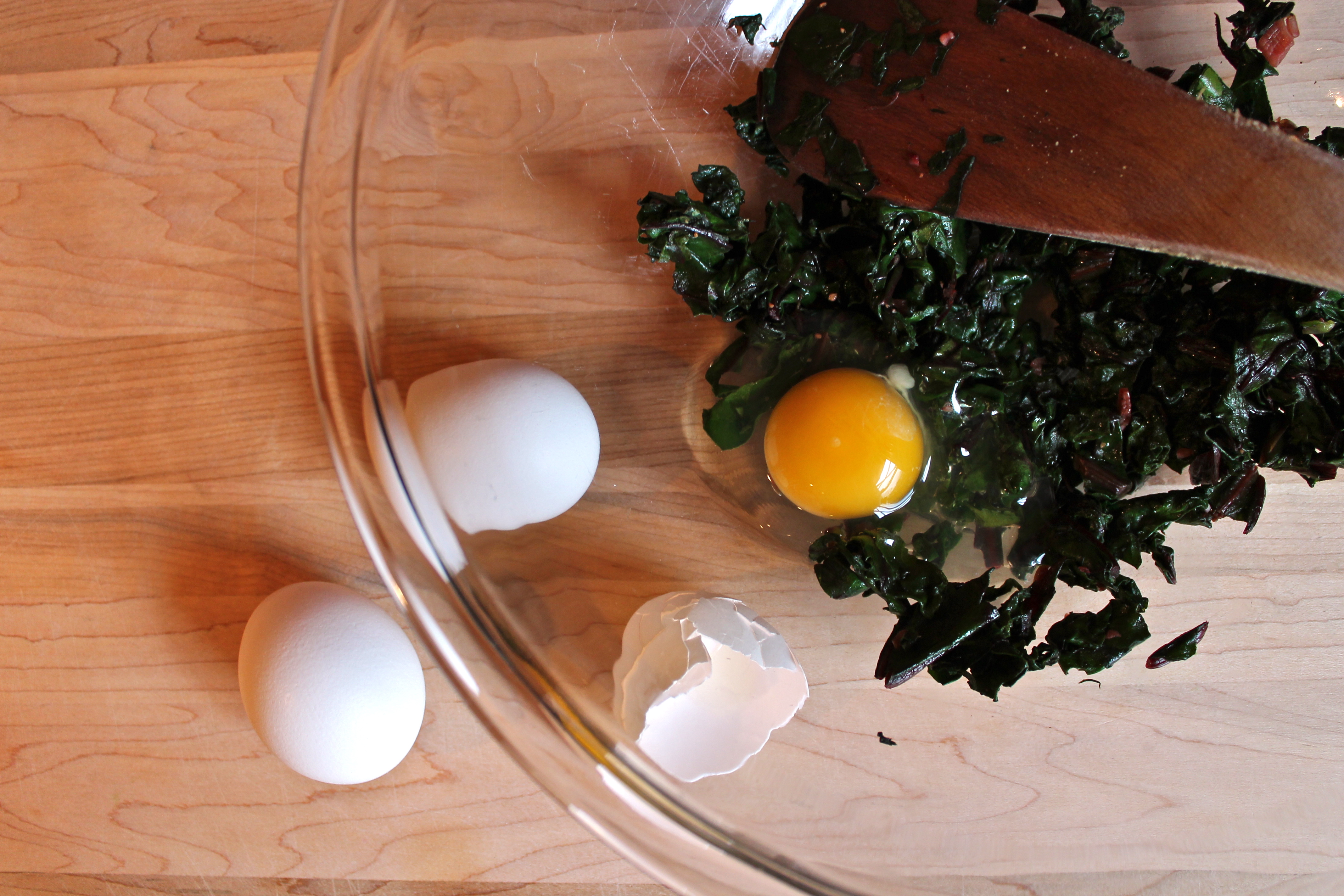 In a large bowl, combine eggs, milk, and chevre.  Whisk to combine.  Add cooled sautéed greens and whisk to combine.  Add salt and pepper to taste.