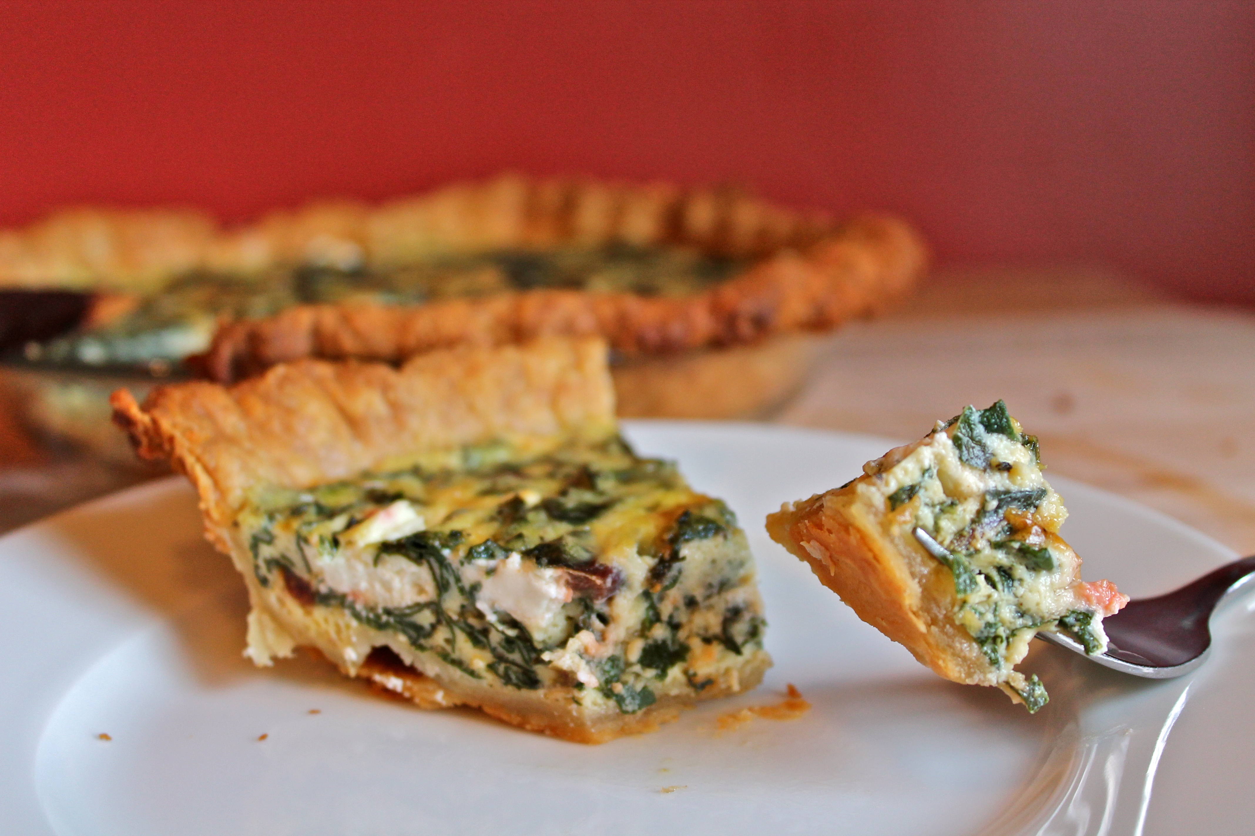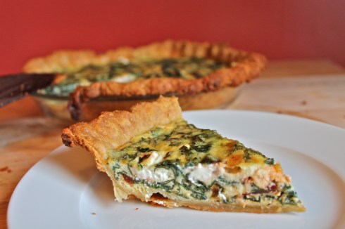 It’s a slippery slope. However, it can also be a delicious and inventive slope, and that’s where this quiche comes in.  Using a bit of leftover this and that from this and THAT (link), we were rewarded with a lovely—and highly adaptable—dinner.  As noted, I used sautéed beet greens that remained from a previous day’s salad, but any greens you have lying around (spinach, chard, kale) will serve this quiche well.  Chevre adds a wonderfully rich tanginess to the body of the quiche, but, if you don’t have it, a bit of Parmesan, Pecorino Romano or Gruyere would also provide a nice, though very different, flavor profile.  The idea here is to use whatever you have staring at you from the fridge, and it’s almost guaranteed that you’ll love the result.