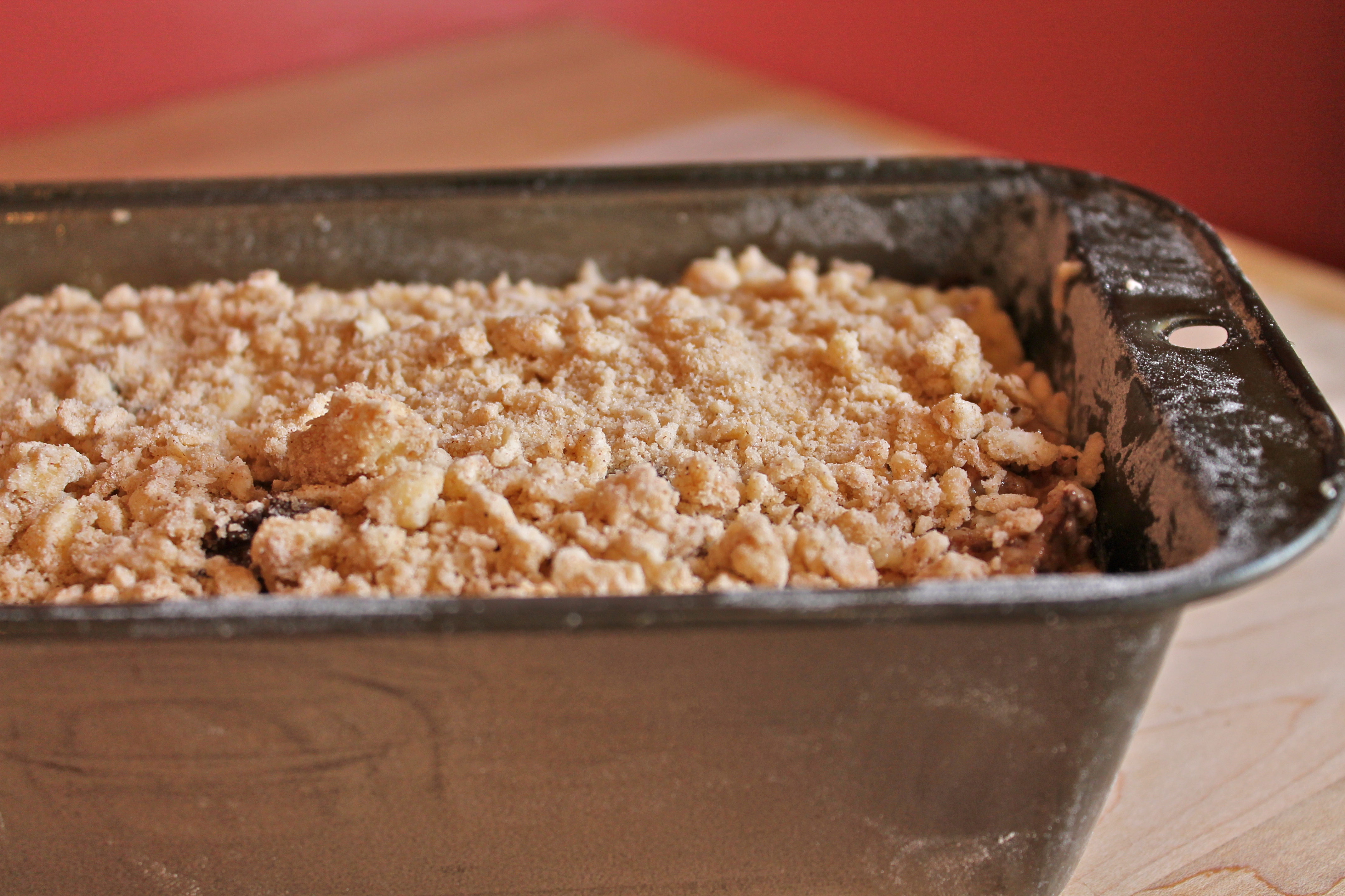 Pour the batter into the loaf pan and top with the remaining streusel. Bake for 50 to 60 minutes, until the bread is firm and pulls away slightly from the sides of the pan. Allow the bread to cool before removing from the pan.