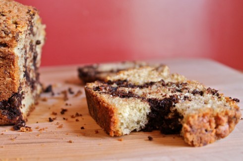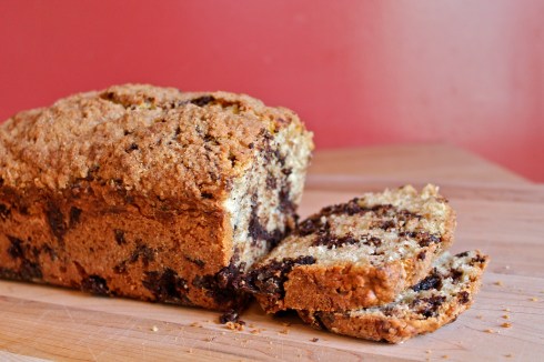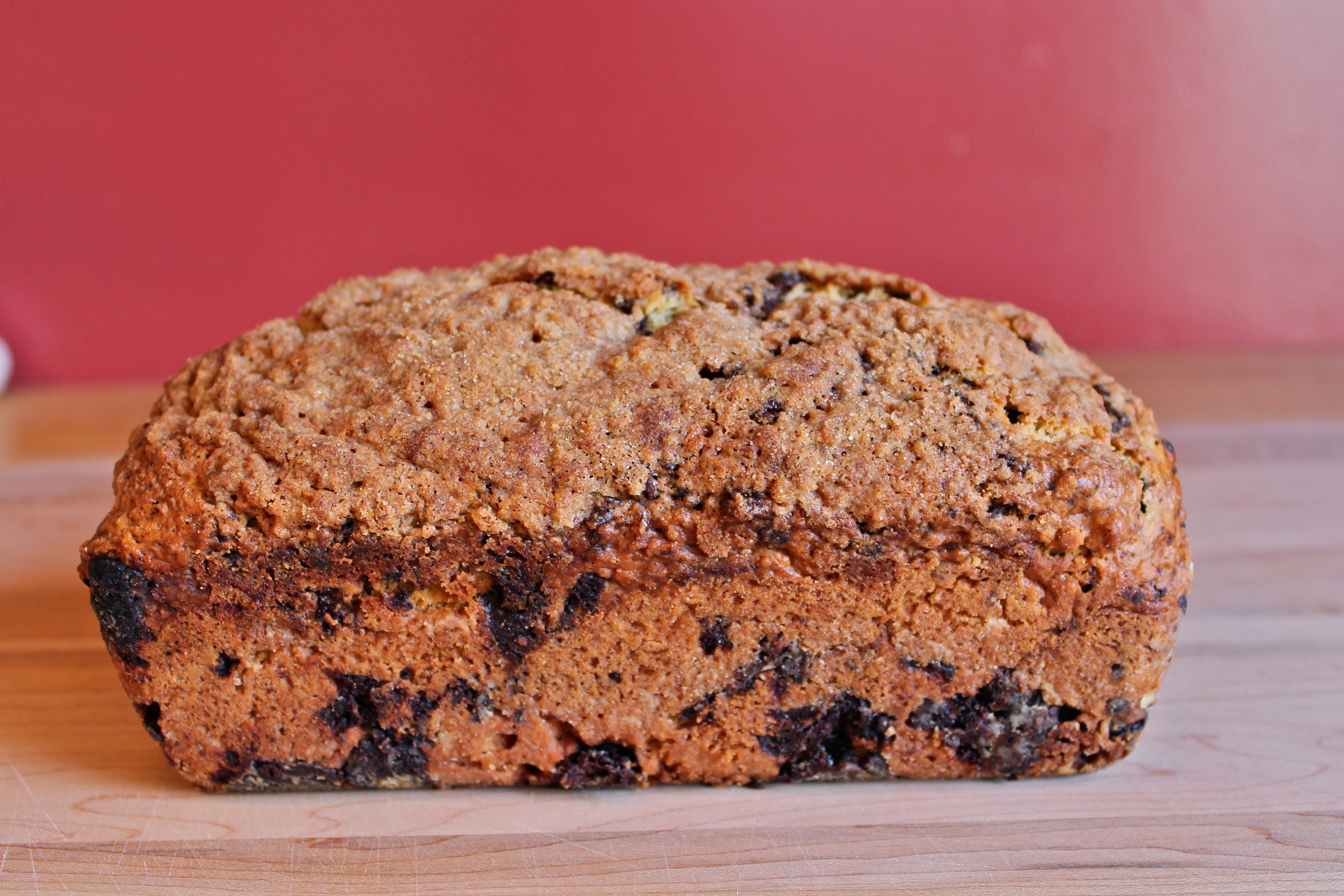 But it is, and there is no better example of this experiment, I believe, than this bread. Yet another bread in only name (due to the fact that it delightfully toes the line between living as a bread and living as a cake), this is an absolutely wonderful treat with its chunks of bittersweet chocolate, hints of cinnamon, and delicate crumb. Everything in this bread, from top to bottom, is perfectly sweetened. A lid of light streusel topping is the perfect antidote to the moist bread beneath, and, with 1/3 of the sugar removed from both the bread and the topping, the crunchy streusel never propels the taste experience from “Oh, this is so delicious,” to “Ouch, call the dentist.”