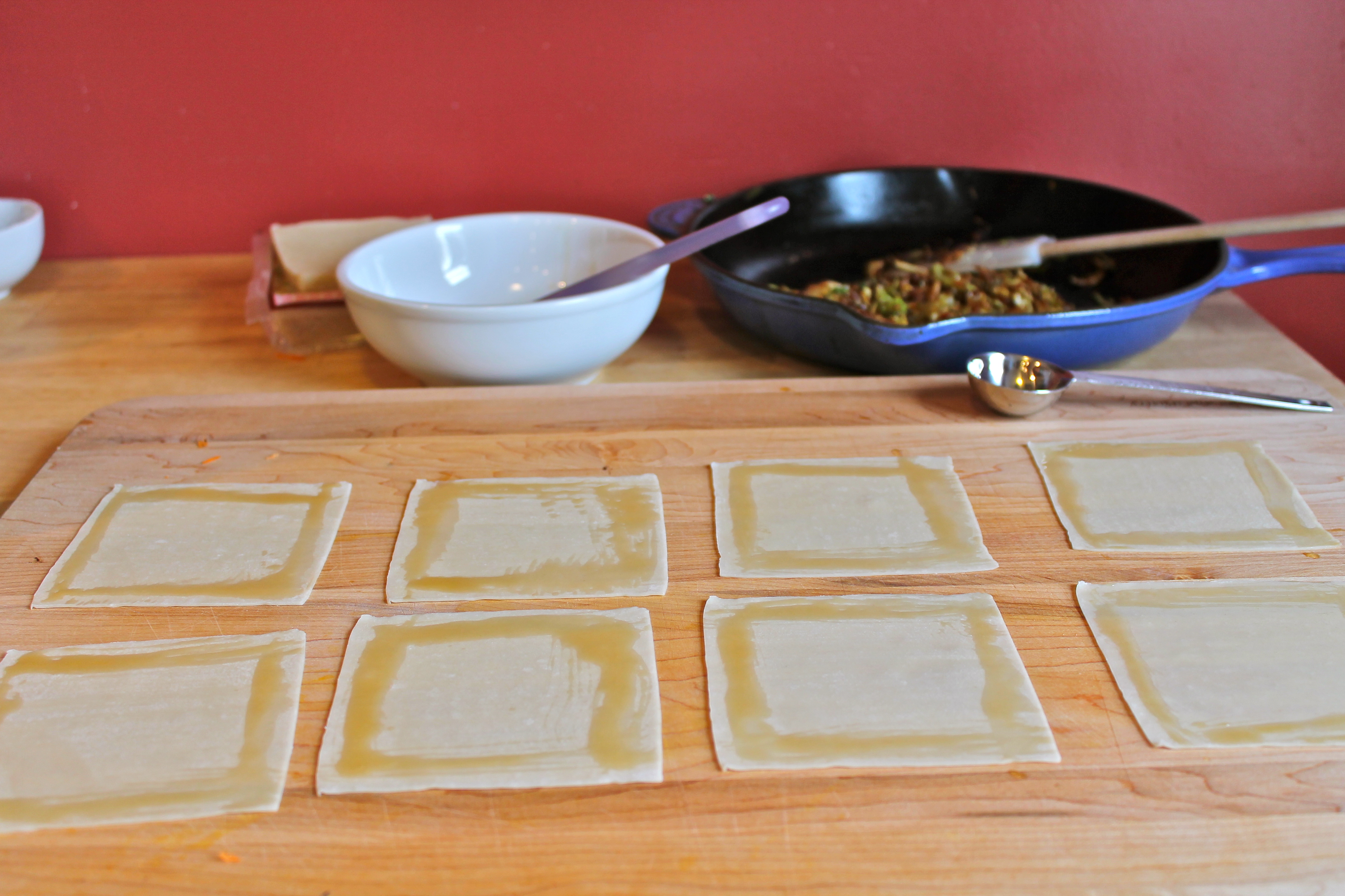 Lay out 12 wonton sheets at a time. With a pastry brush, lightly brush toasted sesame oil all along the edges of the wonton sheets. Drop about 1 tablespoon of the vegetable mixture just a touch off the center of the diagonal middle of each wonton sheet, then fold the sheet diagonally so the opposite corners touch. Using the tines of a fork, press down the 2 open sides (these would be the non-folded sides) of the triangle. Fold in the two pointed edges that jut out from the folded sides of the triangle, and press them in place with the fork. Brush the tops of each completed wonton with a bit more sesame oil.