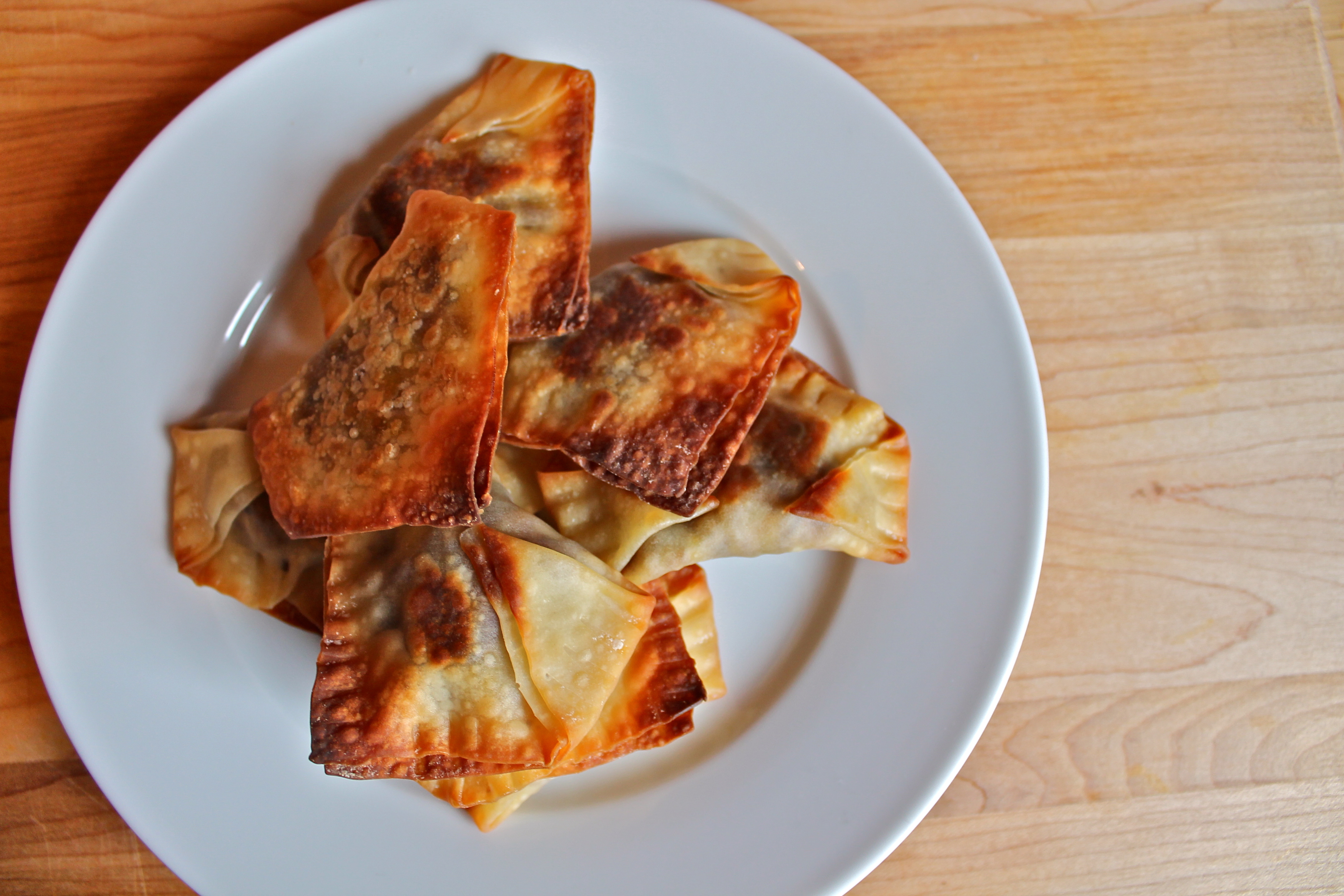 Very lightly spray or brush a baking sheet with vegetable oil. Arrange the completed wontons, about 12 at a time, on the baking sheet. Bake wontons for 6 minutes, then turn them over and return to the oven to bake for an additional 6 minutes, or until the wontons are dark golden brown and very crisp.
