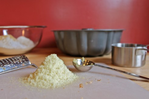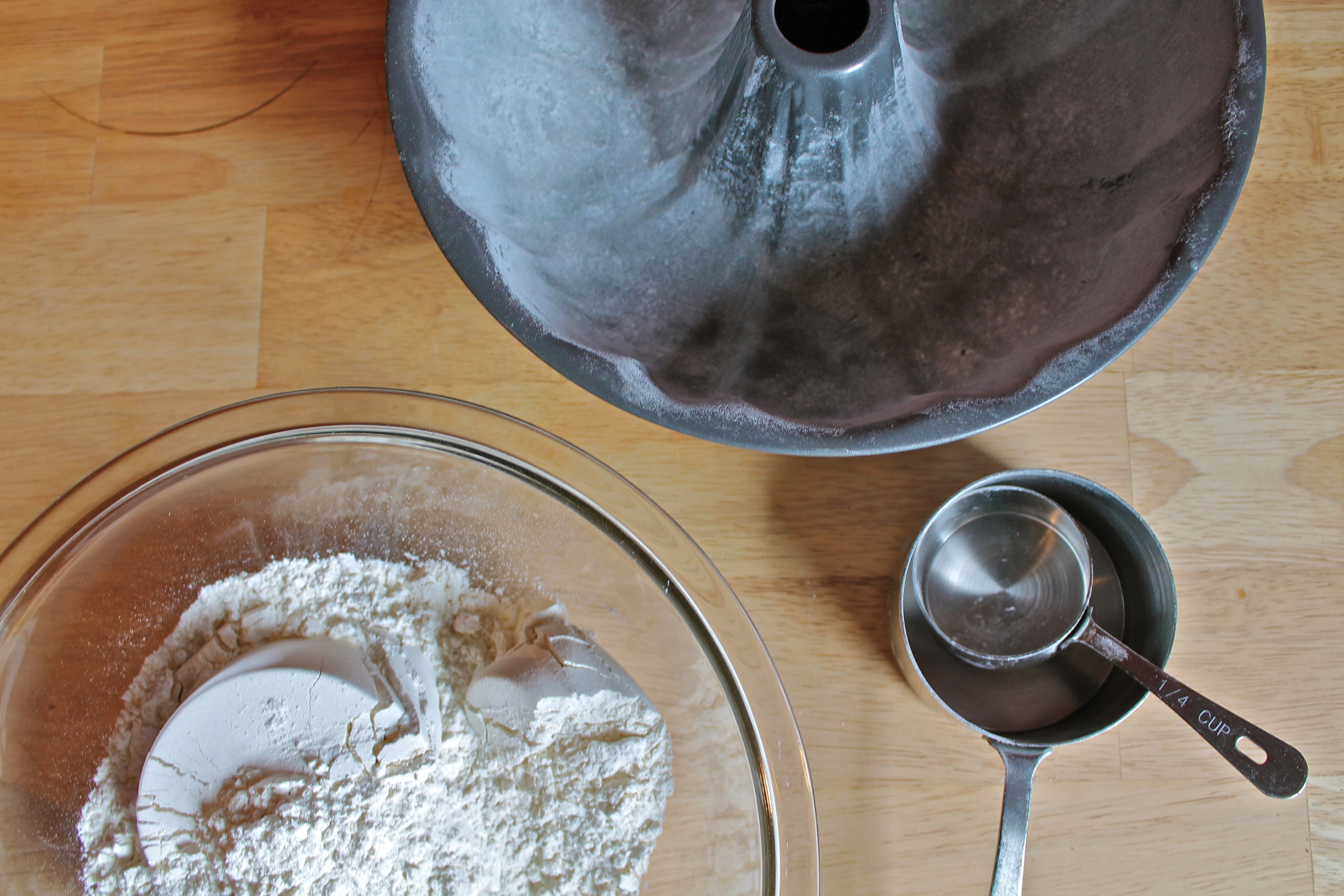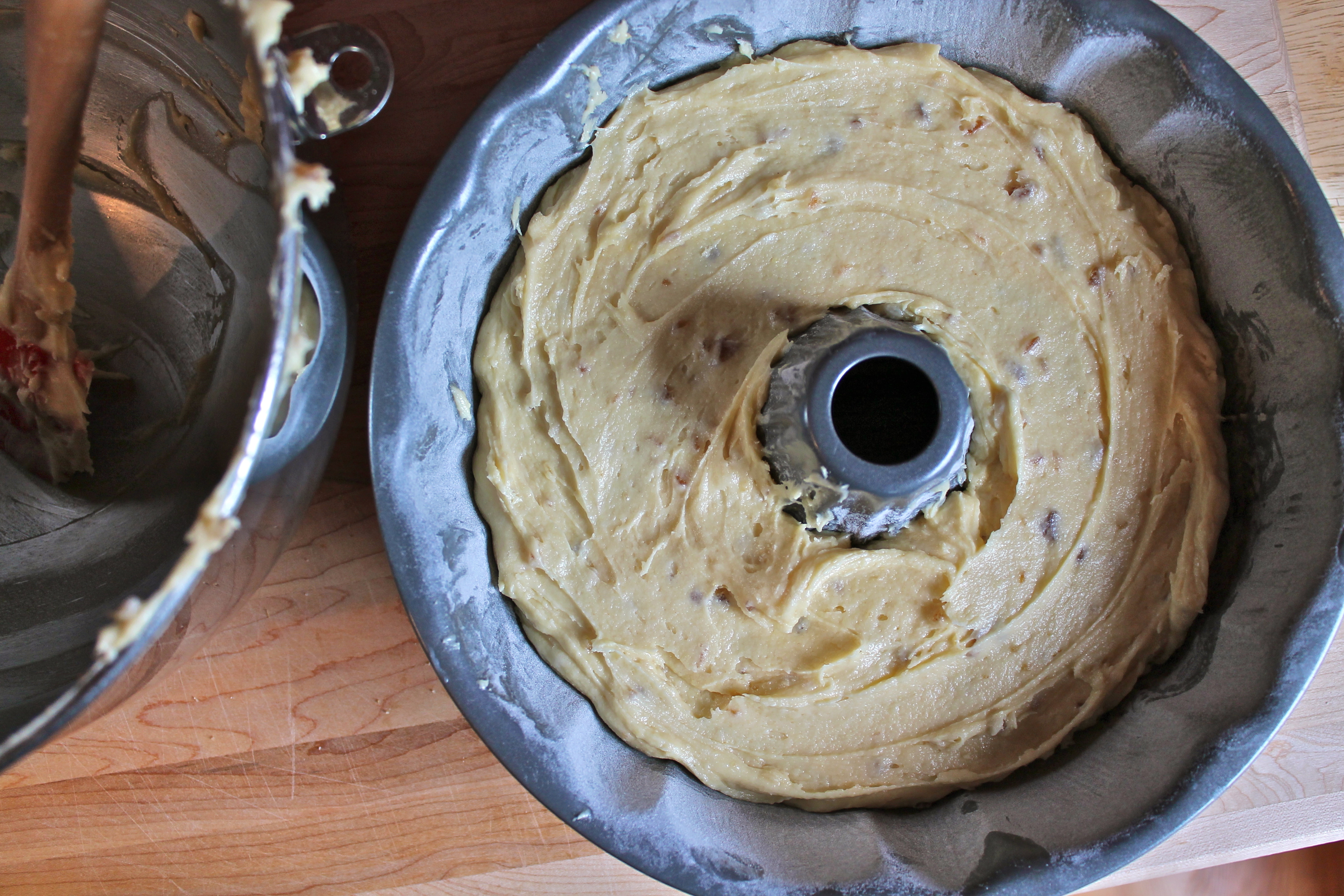 Preheat oven to 350 degrees Fahrenheit. Place an oven rack in the middle position. Thoroughly butter and flour a 12-cup bundt pan.
