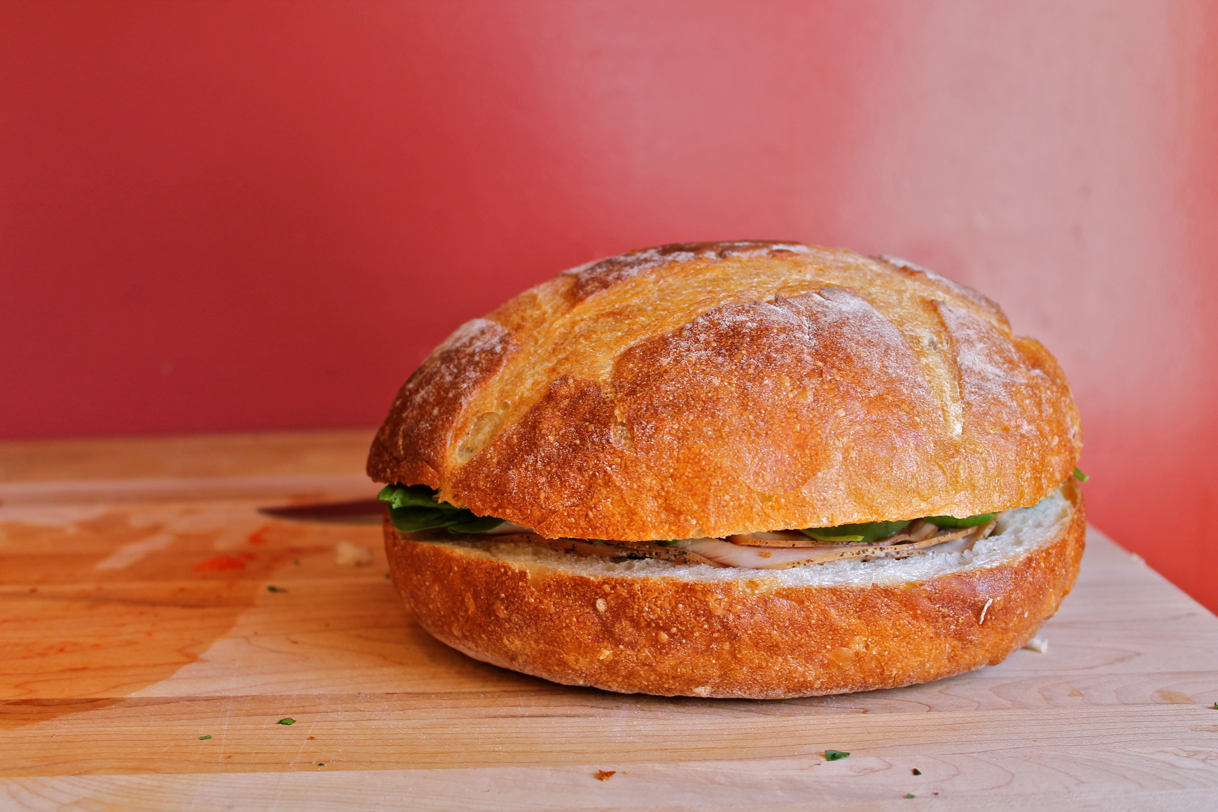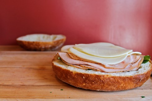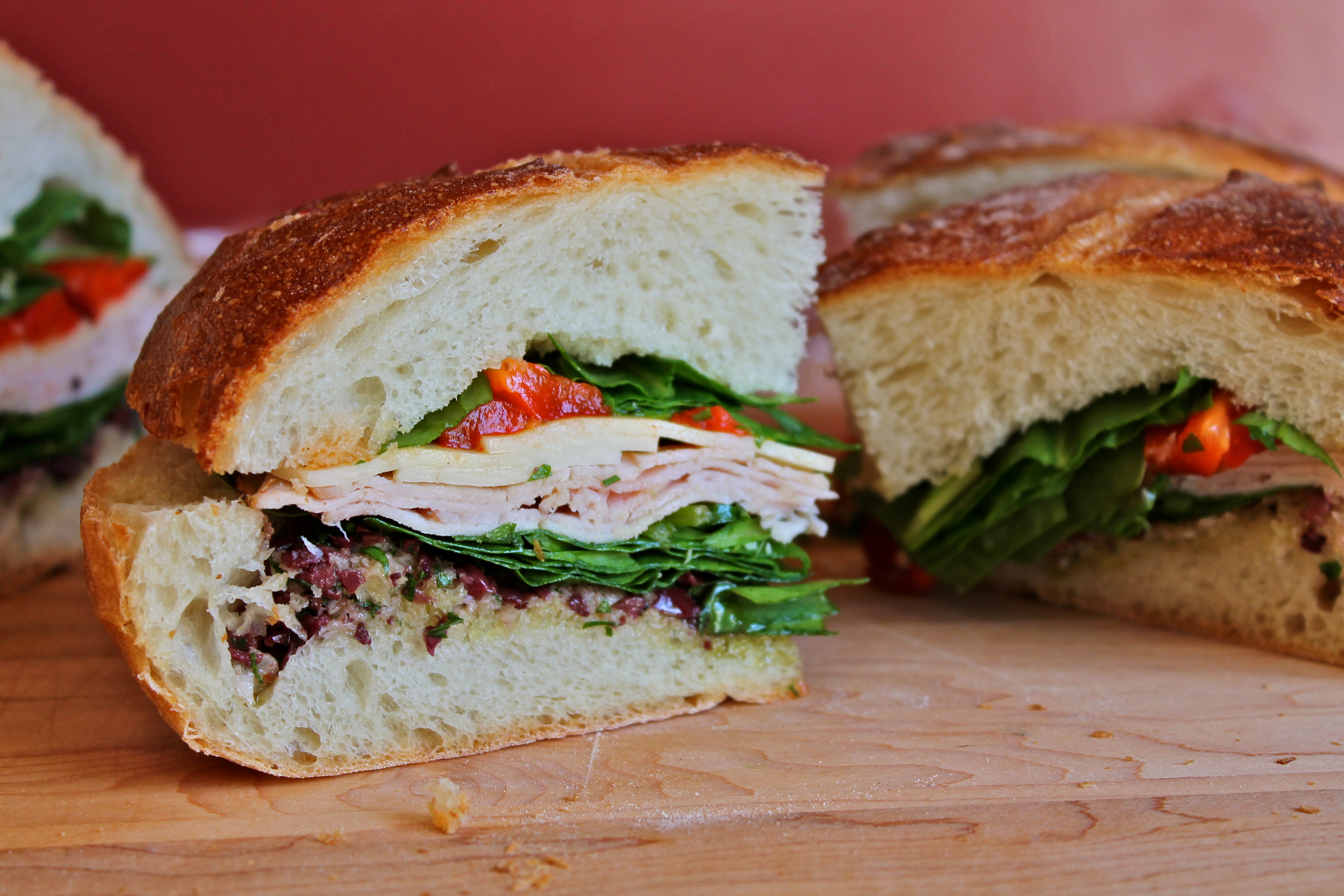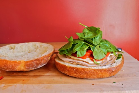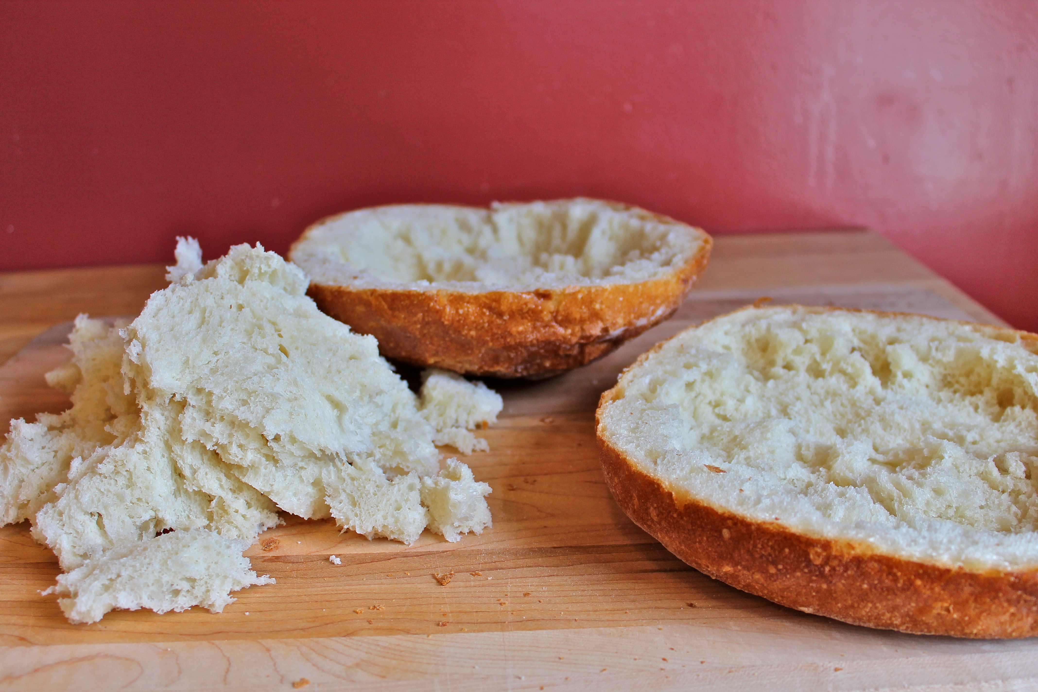 To construct sandwich, cut the loaf of bread in half lengthwise.  Tear out half an inch to one inch of the soft middle of the bread, leaving the bottom of the loaf shallower an the top (leaving a deeper space in the top of the loaf allows you to pile your sandwich ingredients higher with less threat of the sandwich collapsing).  You can reserve the torn-out bread in a plastic bag and freeze it for another use (bread brumbs, romesco sauce, etc.).