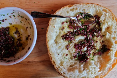 Why the World’s Best?  Let’s start with the construction, an ingenious method of hollowing out a good portion of a hearty round loaf of artisan bread in order to create a cozy little nest for the sandwich’s fillings.  The fillings in question can be altered to satisfy the tastes of the people eating the sandwich, but I nearly always go for the solid combination of provolone cheese, peppered turkey, roasted peppers, lots of leafy greens, and, though I forgot them this time around, big, juicy slices of tomato.  However, let me back up just one moment and mention what might be the crowning achievement of this sandwich: the olive tapenade.  Wonderfully flavorful, the tapenade is the secret weapon of this sandwich, harmonizing tastes and textures and adding that little bit of something extra that makes this sandwich a real standout.