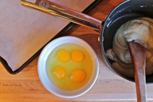 Transfer the mixture to a bowl and allow to cool for 5 minutes.  When the mixture has cooled a bit, beat in the eggs, one at a time, using a wooden spoon.  Beat the dough vigorously in between each egg, making sure each egg is incorporated before adding another.  The dough should end up looking quite smooth and shiny.