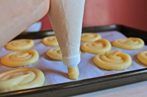 To form cream puffs, fill a pastry bag fitted with a plain, ½-inch tip with choux paste (alternately, you could fill a large Ziploc bag with choux paste, then clip off a corner of the bag with a petite, ½-inch cut).  On the prepared baking sheet, pipe the choux paste into tight swirls about 2 ½ to 3 inches in diameter.  I fit about 11 swirls on one large baking sheet, and had to bake two batches of cream puffs, with 5 swirls in the second batch.