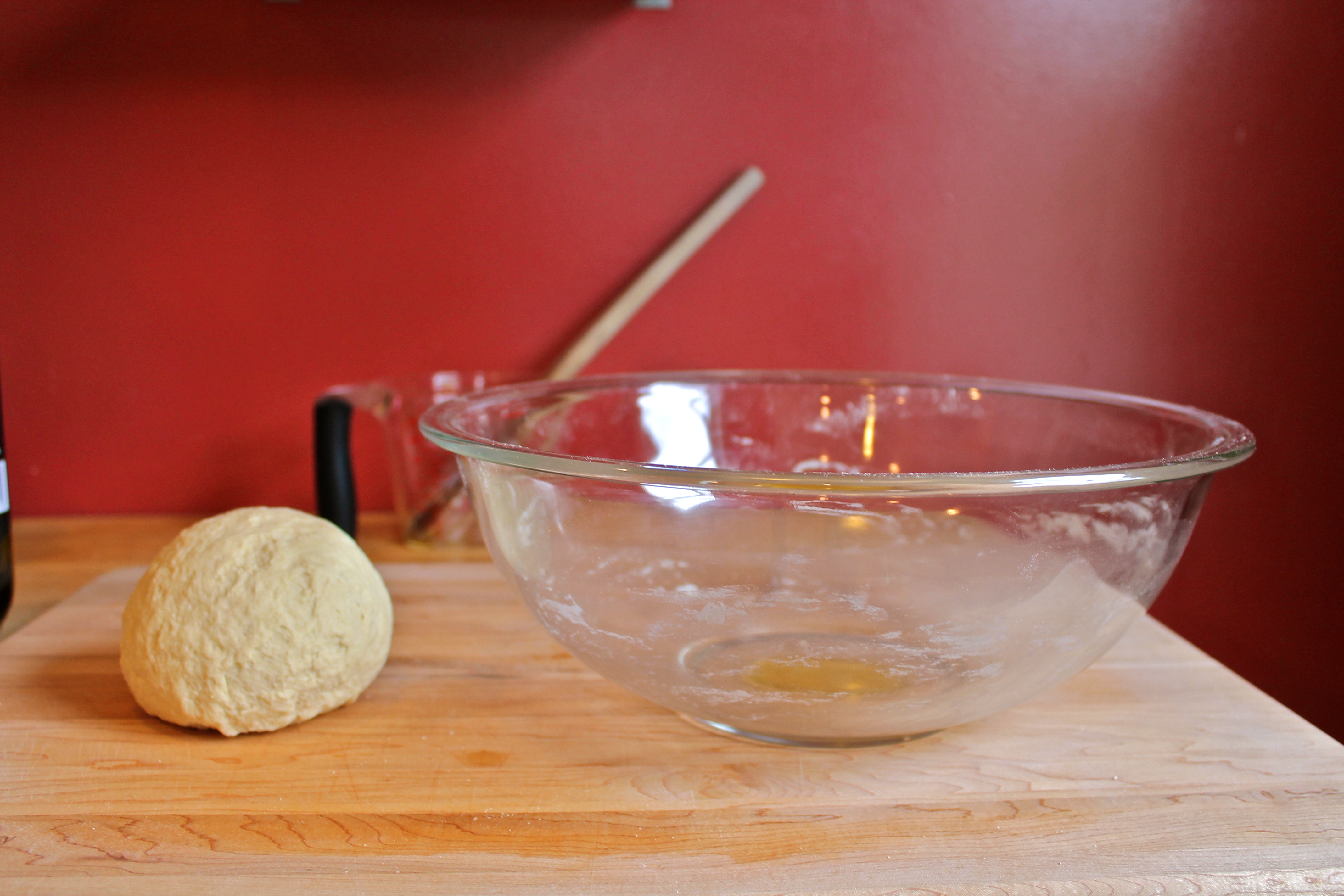 In a large bowl, whisk together bread flour, semolina flour, pinch of salt, and rapid rise yeast.  Pour the water mixture into the flour mixture, stirring with a wooden spoon.  When the ingredients are well combined (the mixture will look a bit shaggy), start kneading the dough, still in the bowl, with your hands.  Knead the dough, turning it over onto itself several times, until it is smooth and somewhat shiny, about 3-4 minutes total.  Form the dough into a ball.  Drizzle a bit of olive oil over the top of the dough, then roll it around in the bowl to coat it all over with oil.  Cover the bowl with a sheet of plastic wrap or a moistened towel, and leave the dough to rise for 1 ½ to 2 hours, until it is large and puffy and more than doubled in size.  Alternately, you can cover the bowl with plastic wrap and then place it in the refrigerator to rise overnight.
