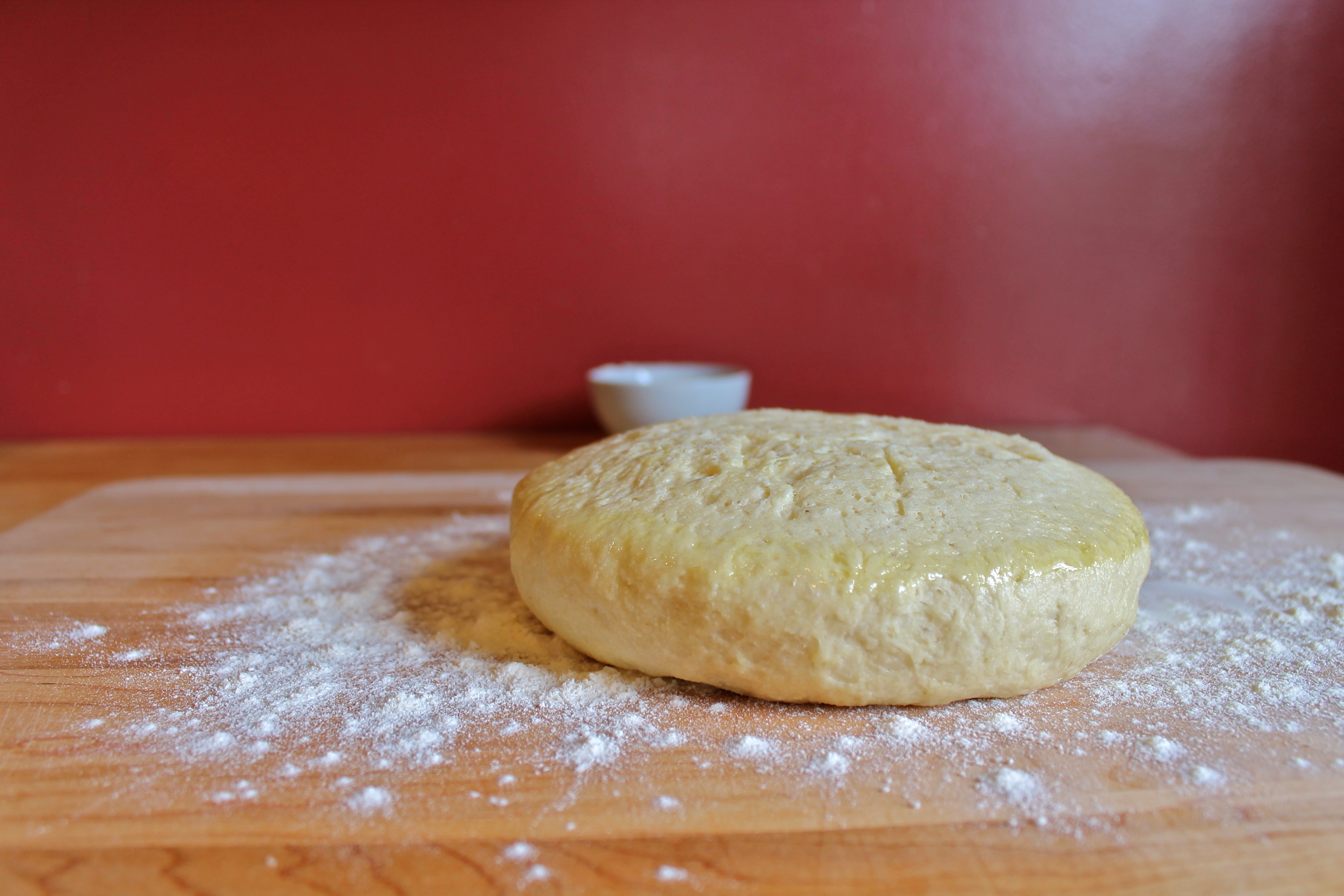 Slide the dough, still on its sheet of parchment paper, onto the heated baking sheet or pizza stone in the oven.  Bake for 10 minutes, until the edges of the dough are golden brown and slightly puffed.