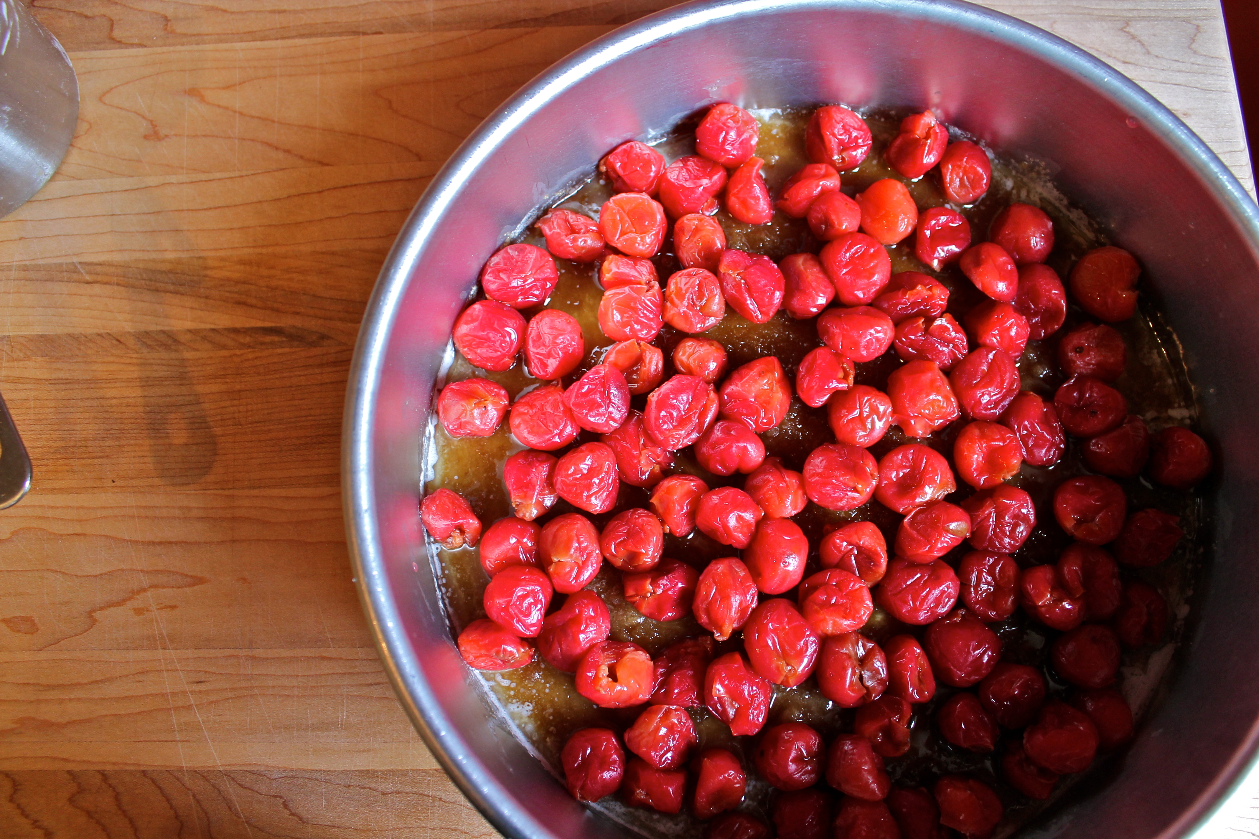 It’s not as obsessive a plan as it may seem.  I, of course, share whatever I make when the initial sour cherry season comes around, but sometimes, if I am lucky, all my pie-making and galette-fashioning leaves me with not quite enough cherries to fill a new pastry, but certainly enough sour cherries to stick in the freezer and save for as long as I can.  Believe it or not, in between last sour cherry season and this year’s upcoming one, I was able to hold onto a good amount of cherries.  I’ve been making them into syrups, using them to fill the occasional tiny pastry, and last week, when I reached the end of my stash, I worked them into a new riff on that summertime favorite, pineapple upside down cake.  Only in this case I left out the pineapple all together and instead baked a cake atop a bed of sour cherries nestled in a bed of brown sugar and butter.