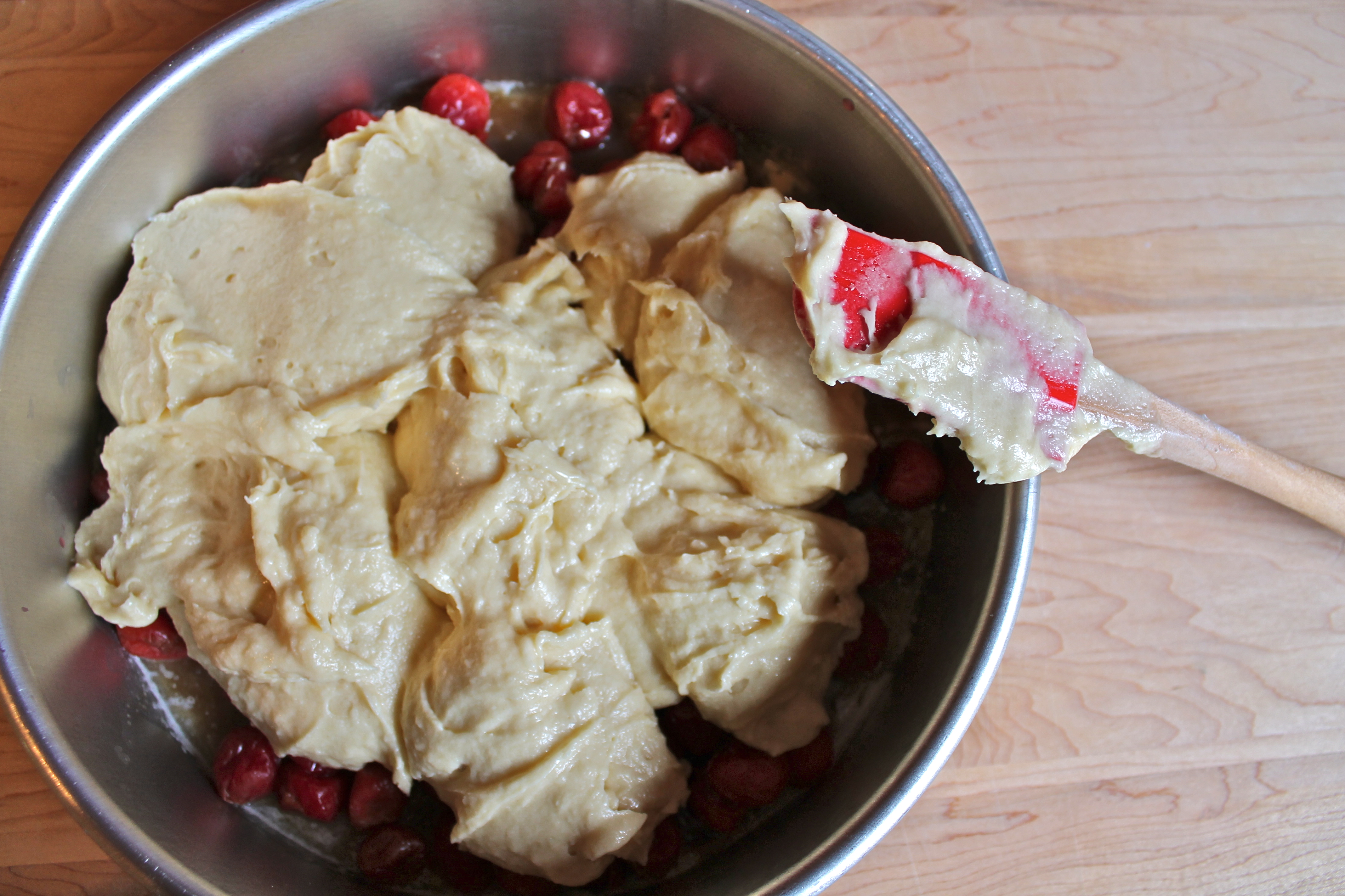Spoon the batter over the cherries, then gently smooth the top.  Gently tap the pan on top of the counter to settle the batter amongst the cherries.  Bake the cake in the center of the oven until a cake tester emerges with just a few moist crumbs attached, about 45 to 50 minutes, rotating pan after about 20 minutes.