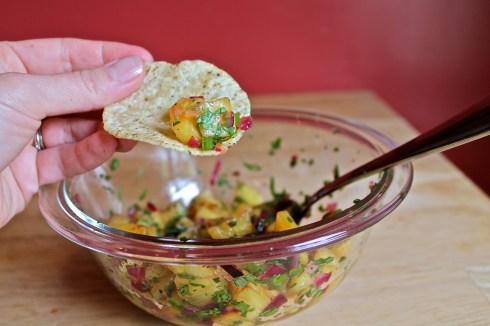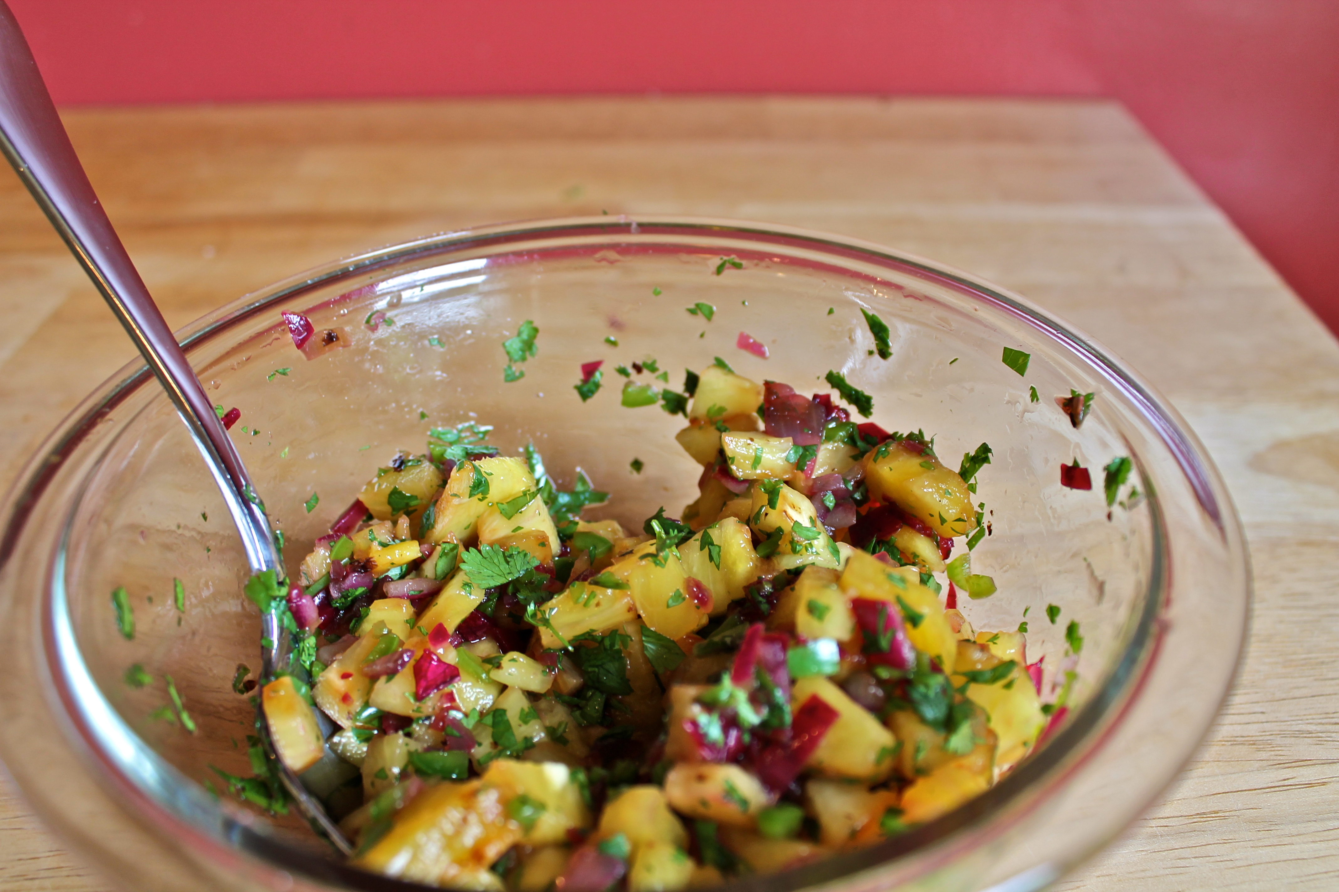 When cooled, finely dice both onion and jalapeno. Dice pineapple in to ½-inch chunks. Combine in a medium bowl, along with cilantro, lime juice, and salt. Toss everything to combine, and add more lime juice and salt as you see fit.