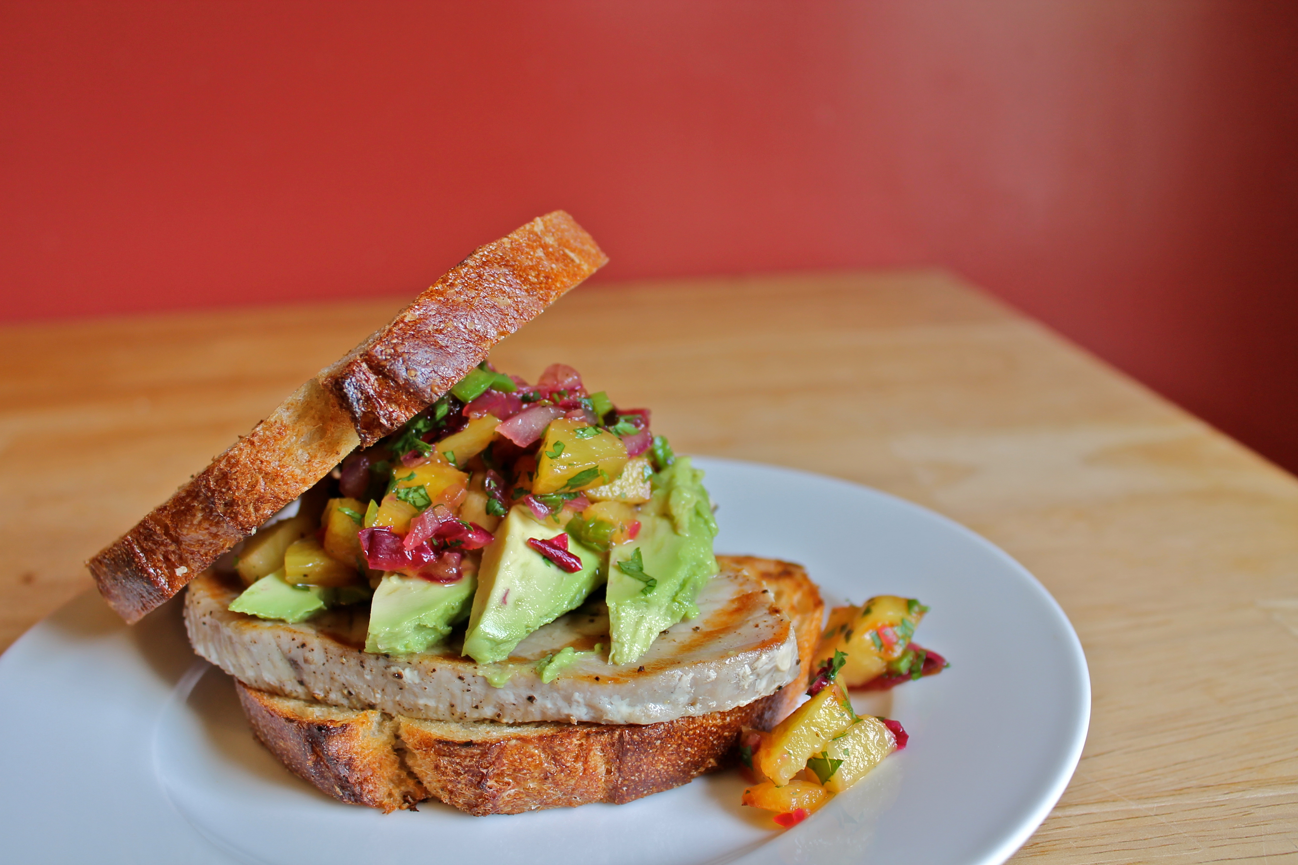 To assemble a sandwich, place a grilled tuna steak on a piece of grilled or toasted bread. Top with slices of avocado, a large scoop of salsa, then place another piece of grilled or toasted bread on top. Slice in half for easier eating. So delicious.