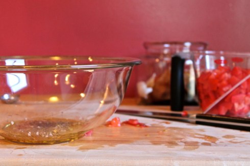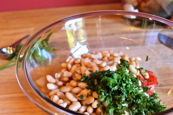 In a large bowl, combine minced garlic with olive oil and red wine vinegar. Stir to combine, then set aside while you seed and chop the tomatoes. Add tomatoes to garlic and olive mixture, along with the white beans, chopped herbs, salt and pepper. Stir to combine, then taste for seasoning.