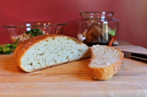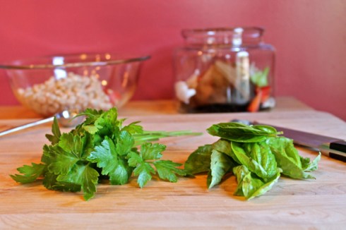 It was with my best friend in mind that I made this fresh, summery bruschetta. Grilled bread, brushed with olive oil, then topped with a garlicky combination of white beans, fresh tomatoes, and a handful of herbs, makes for a highly enjoyable meal, whether you are interested in throwing together a simple dinner for two or a light appetizer for a crowd. Serve this with sturdy crackers for dipping and it transforms into an even more casual affair. Mix it up with some orzo and you’ve got a great summer salad on your hands (and in your mouth). Or you can do what I did: take it over to a friend’s house, place it in the refrigerator, then sit around chatting and enjoying each other’s company until  hunger strikes or a certain newborn baby allows for a bit of respite by taking a long afternoon nap (whichever comes first).